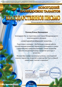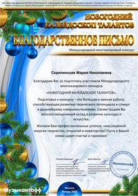 Поздравляем Рушманову Веронику – лауреата I степени Международного многожанрового конкурса «Новогодний калейдоскоп талантов». Преподаватель Скрипинская Мария Николаевна, концертмейстер Попова Елена Леонидовна. Желаем дальнейших творческих побед!