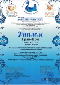 Поздравляем Гуркину Марию – обладателя высшей награды – ГРАН-ПРИ XVIII Всероссийского конкурса «ВОЛЖСКИЕ УЗОРЫ-2022 г.» Преподаватель Стромилова Оксана Степановна, концертмейстер Шубина Наталья Анатольевна. Желаем дальнейших творческих побед!
