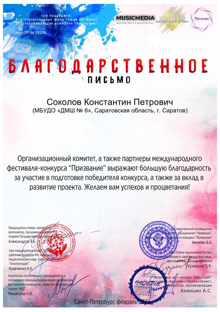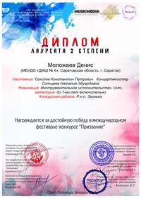 Поздравляем Моложаева Дениса – лауреата II степени Международного фестиваля-конкурса «Призвание». Преподаватель Соколов Константин Петрович, концертмейстер Солнцева Наталья Эдуардовна. Желаем дальнейших творческих успехов!