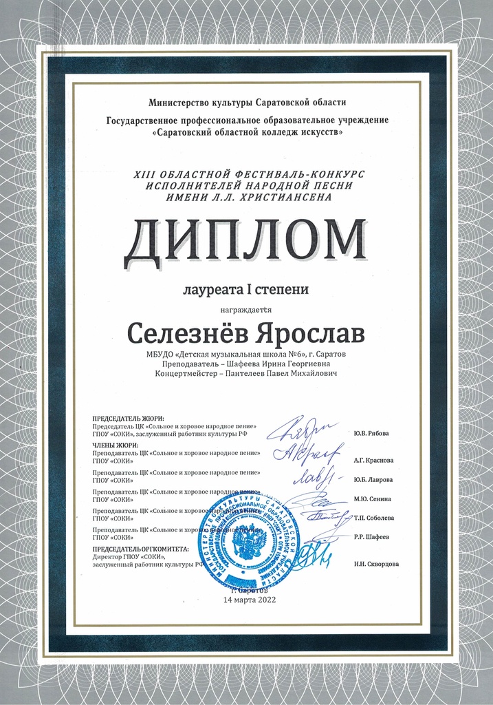 Селезнёва Ярослава - лауреата I степени