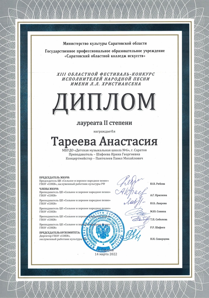 Тарееву Анастасию - лауреата II степени
