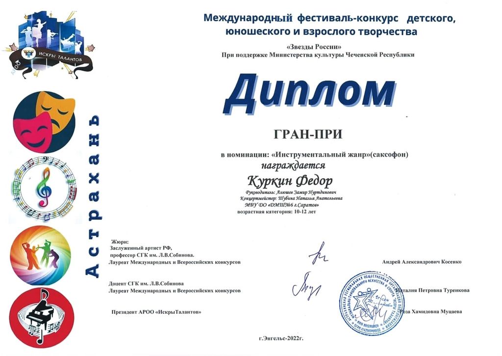 Куркина Фёдора – обладателя высшей награды – ГРАН-ПРИ