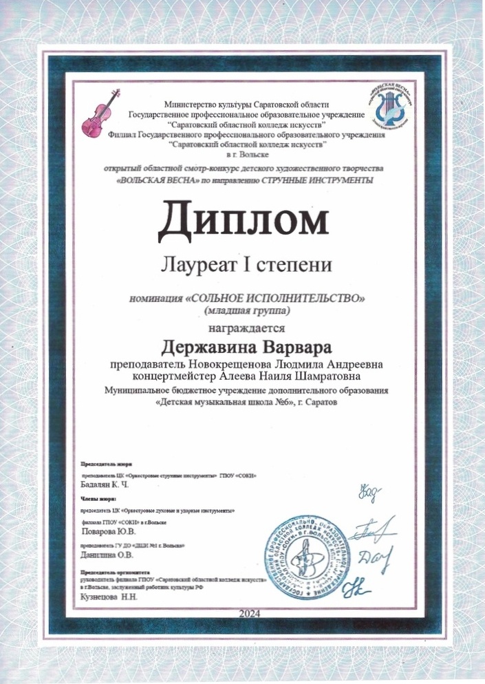 Державину Варвару – лауреата I степени в номинации «Сольное исполнительство (младшая группа)». Преподаватель Новокрещенова Людмила Андреевна, концертмейстер Алеева Наиля Шамратовна.