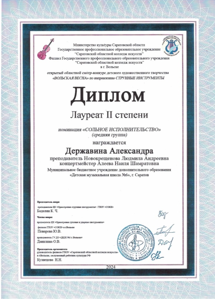 Державину Александру – лауреата II степени в номинации «Сольное исполнительство (средняя группа)». Преподаватель Новокрещенова Людмила Андреевна, концертмейстер Алеева Наиля Шамратовна.
