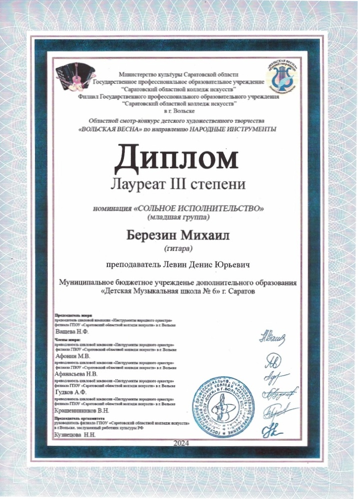 Березина Михаила - лауреата III степени в номинации «Сольное исполнительство (младшая группа)». Преподаватель Левин Денис Юрьевич.