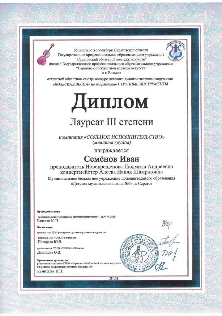 Семёнова Ивана – лауреата III степени в номинации «Сольное исполнительство (младшая группа)». Преподаватель Новокрещенова Людмила Андреевна, концертмейстер Алеева Наиля Шамратовна.
