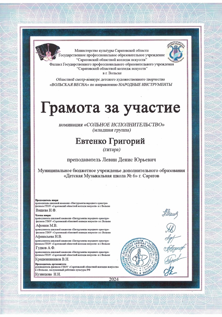 Евтенко Григория – обладателя грамота за участие в номинации «Сольное исполнительство (младшая группа)». Преподаватель Левин Денис Юрьевич.