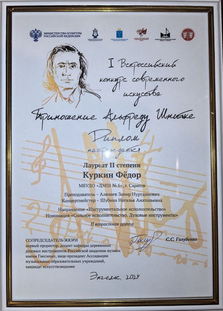В направлении «Музыкально-теоретическая олимпиада «Пространство творчества А.Г. Шнитке» Куркин Фёдор – диплом участника. Преподаватели Анащенко Людмила Геннадьевна, Пархоменко Ольга Алексеевна.