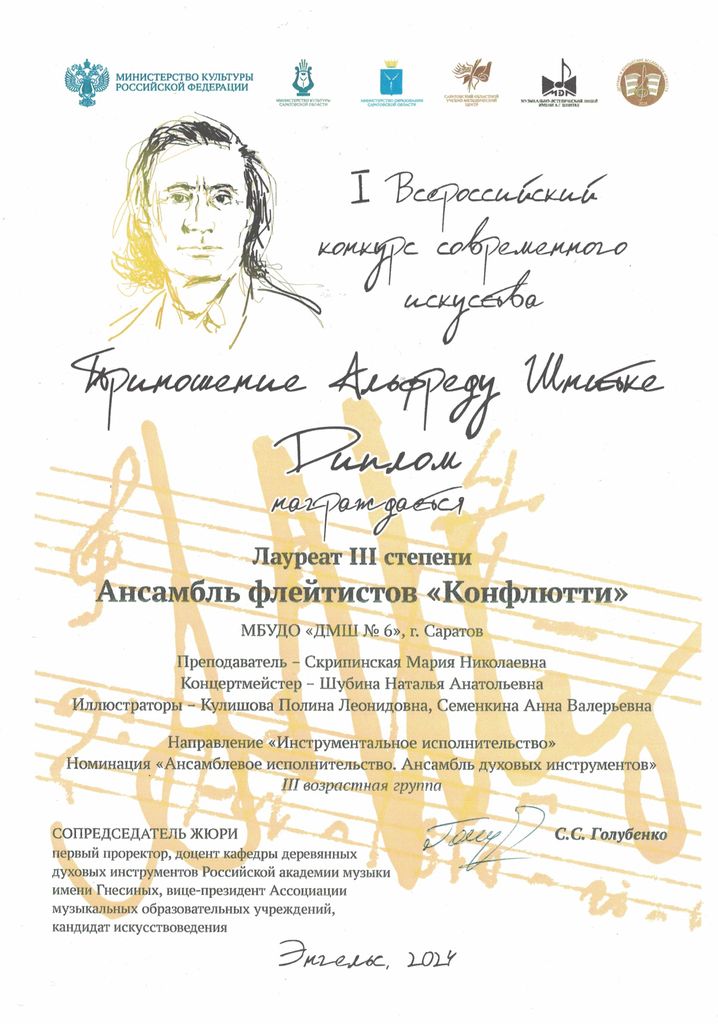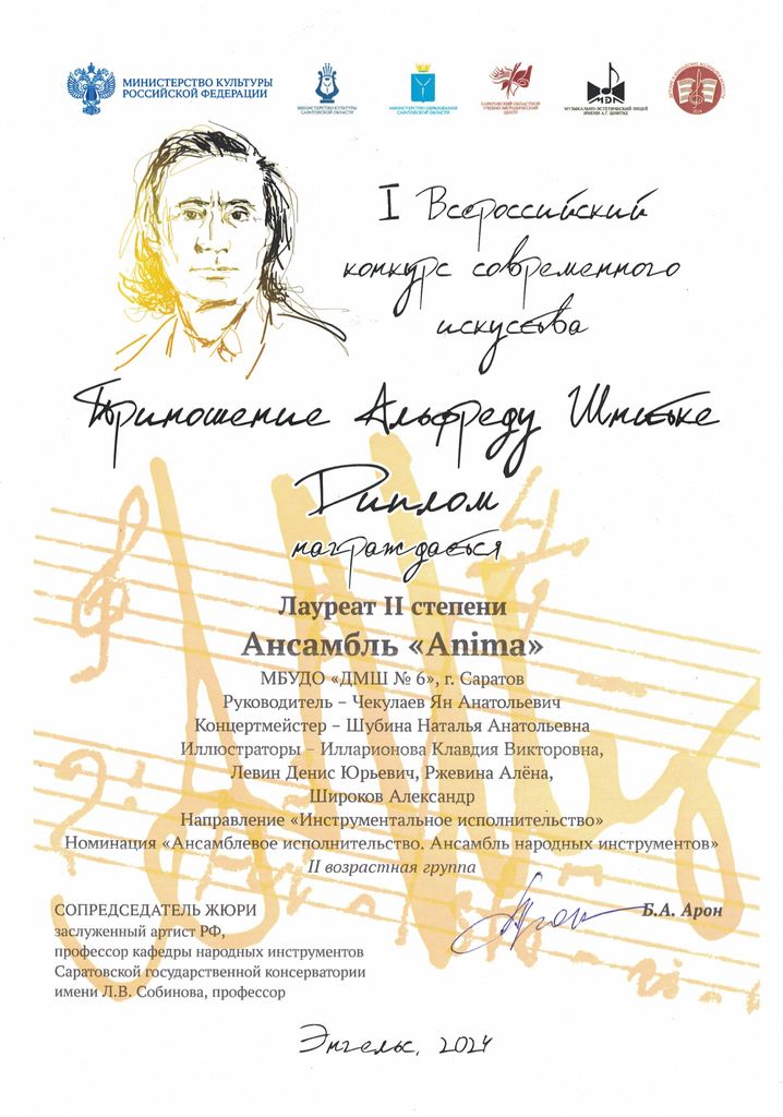 К 90-летию со дня рождения нашего земляка, композитора А. Шнитке, с 21 по 24 ноября 2024 года, в Музыкально-эстетическом лицее имени А.Г. Шнитке проходил I Всероссийский конкурс современного искусства «Приношение Альфреду Шнитке». Более 400 участников из разных уголков страны прошли отборочный тур конкурса. Жюри конкурса составили ведущие деятели культуры и искусства из Еревана, Москвы и Саратова.