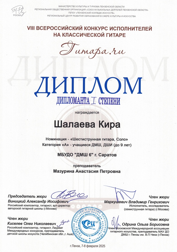 В конкурсе очно участвовала учащаяся Детской музыкальной школы № 6 Шалаева Кира, ставшая дипломантом I степени. Кира принимала участие в мастер-классе члена Московской Международной ассоциации гитарного искусства Ольги Одриной.