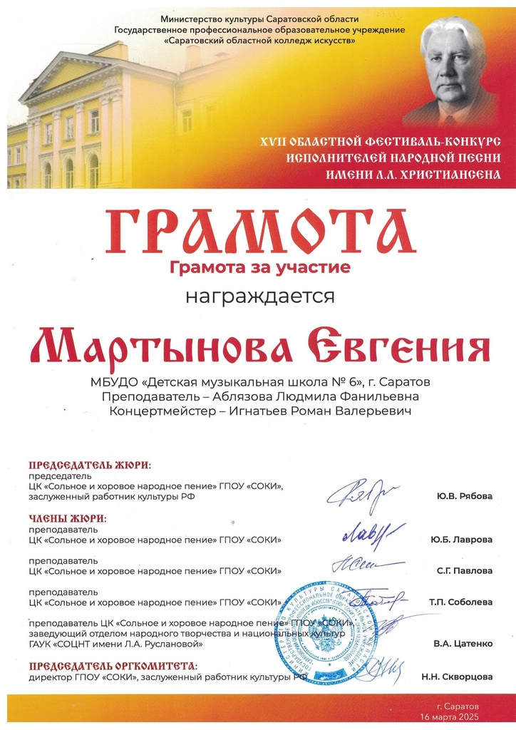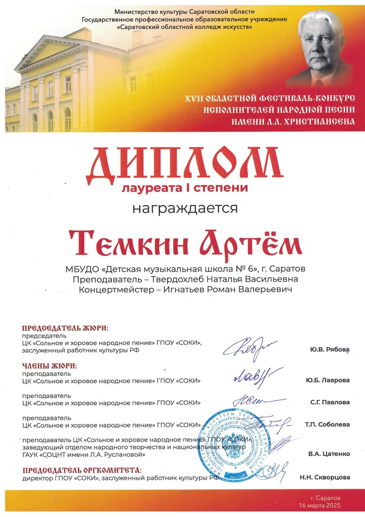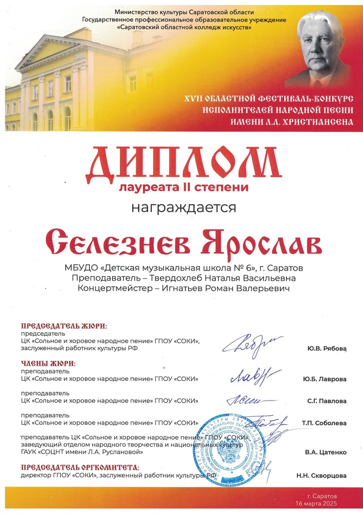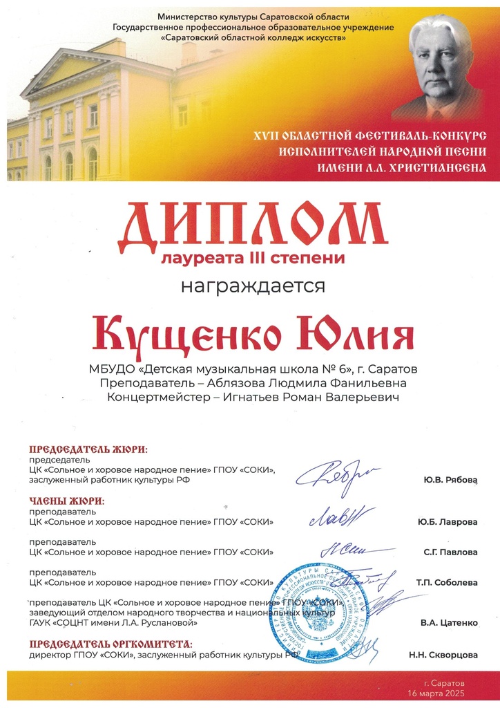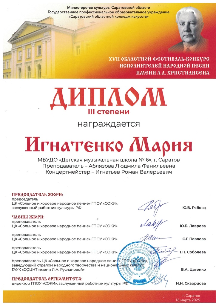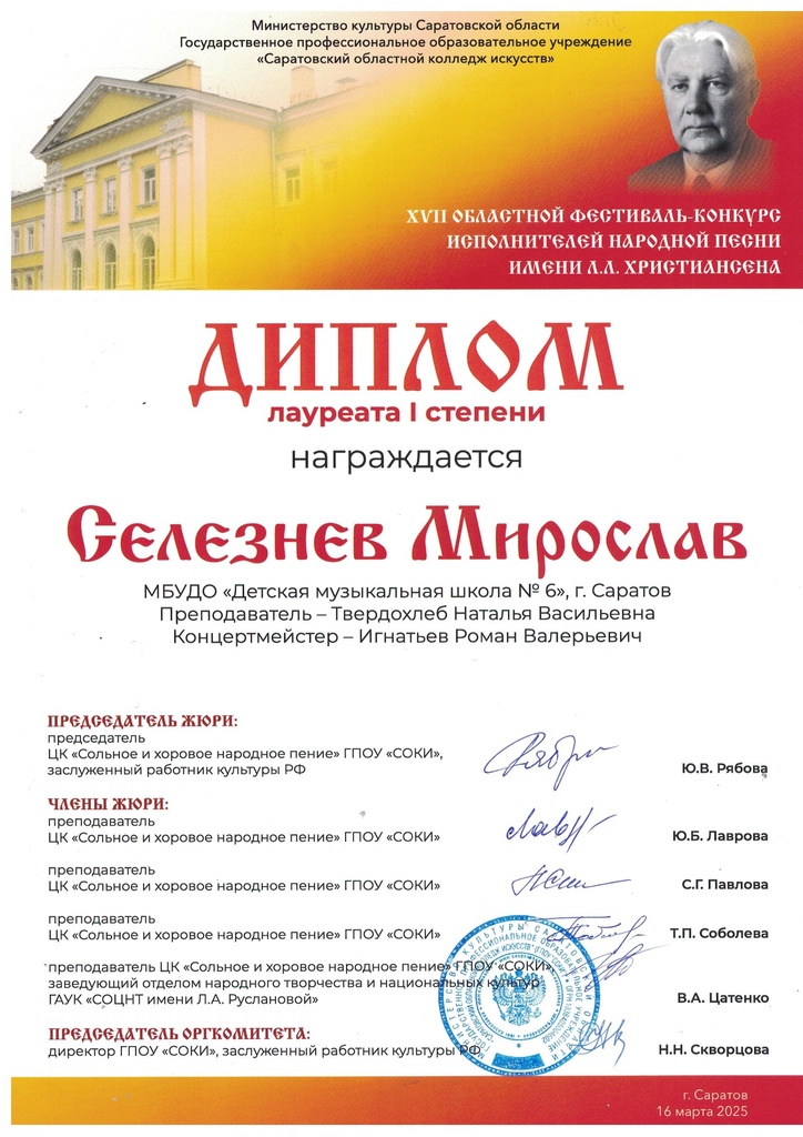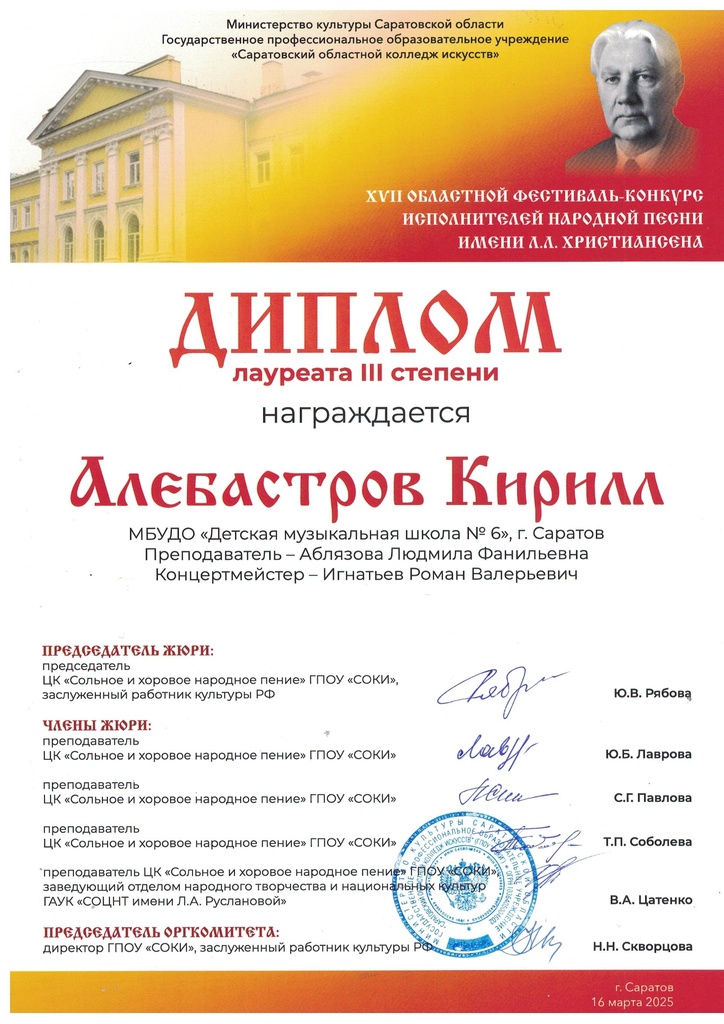 Преподаватели Твердохлеб Наталья Васильевна, Аблязова Людмила Фанильевна, концертмейстеры Игнатьев Роман Валерьевич, Вышегородцев Илья Алексеевич.