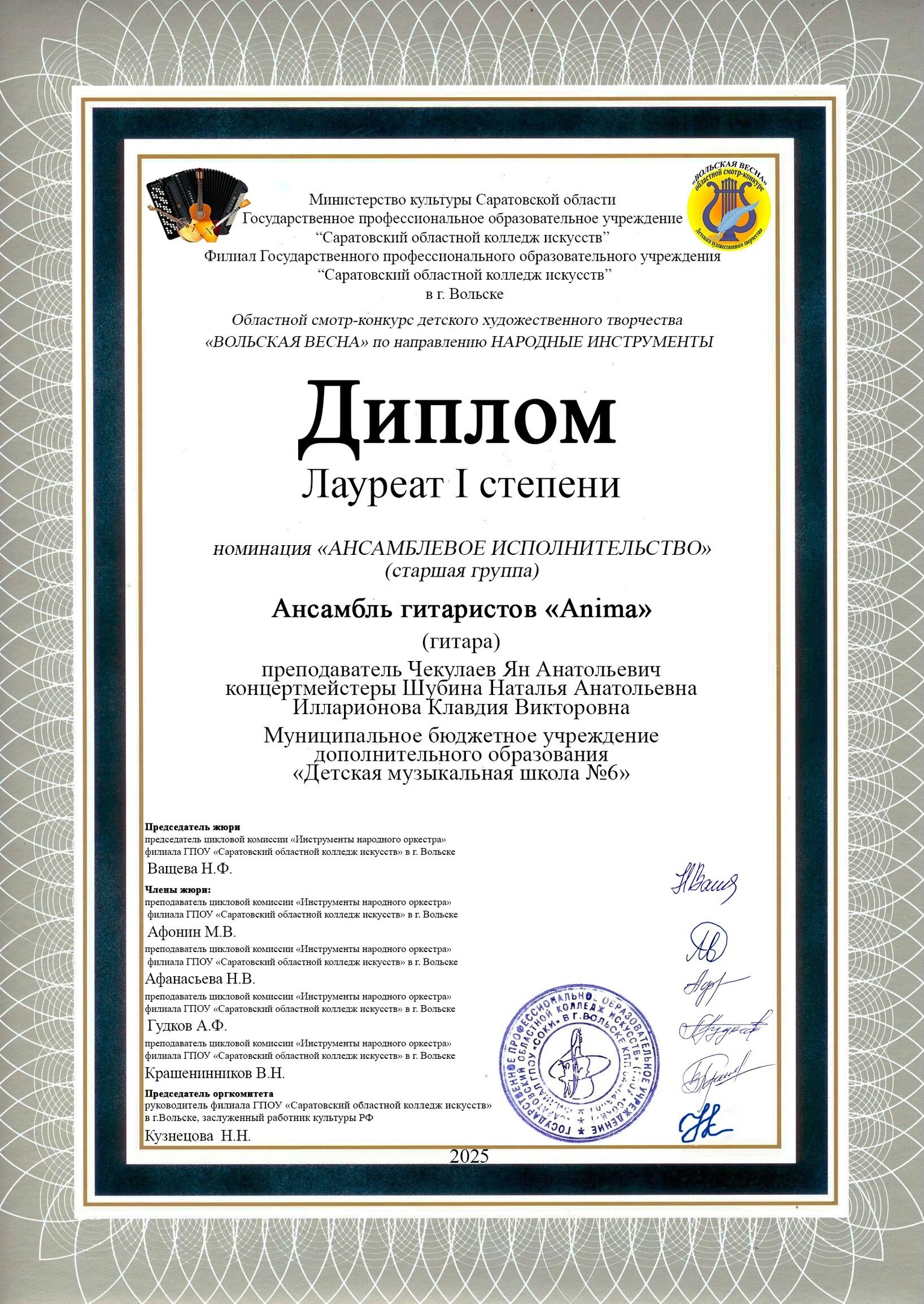 Ансамбль гитаристов «Anima» – лауреат I степени. Преподаватель Чекулаев Ян Анатольевич, концертмейстер Шубина Наталья Анатольевна.