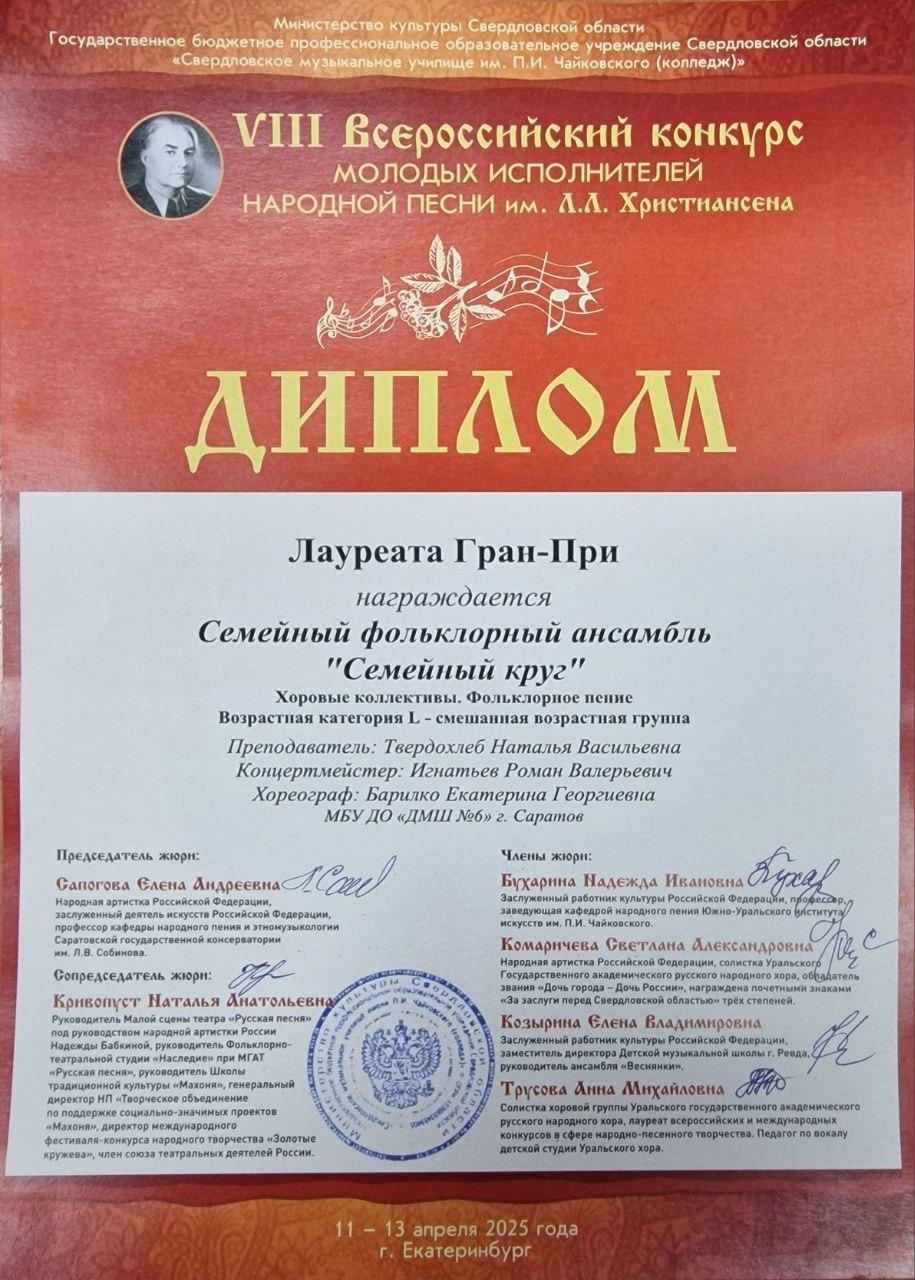 По итогам конкурсных выступлений семейный фольклорный ансамбль «Семейный круг» Детской музыкальной школы № 6 завоевал высшую награду конкурса – ГРАН-ПРИ! Преподаватель Твердохлеб Н.В., концертмейстер Игнатьев Р.В., хореограф Барилко Е.Г.
