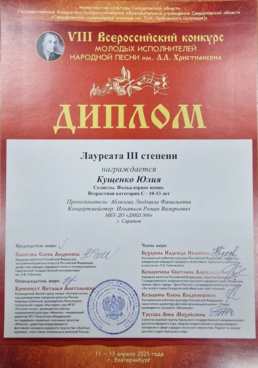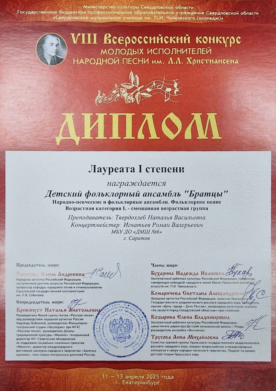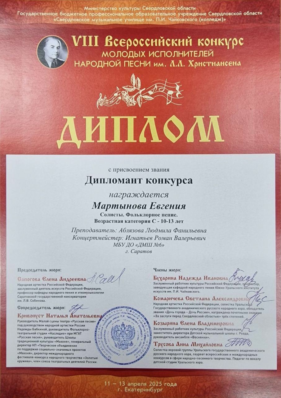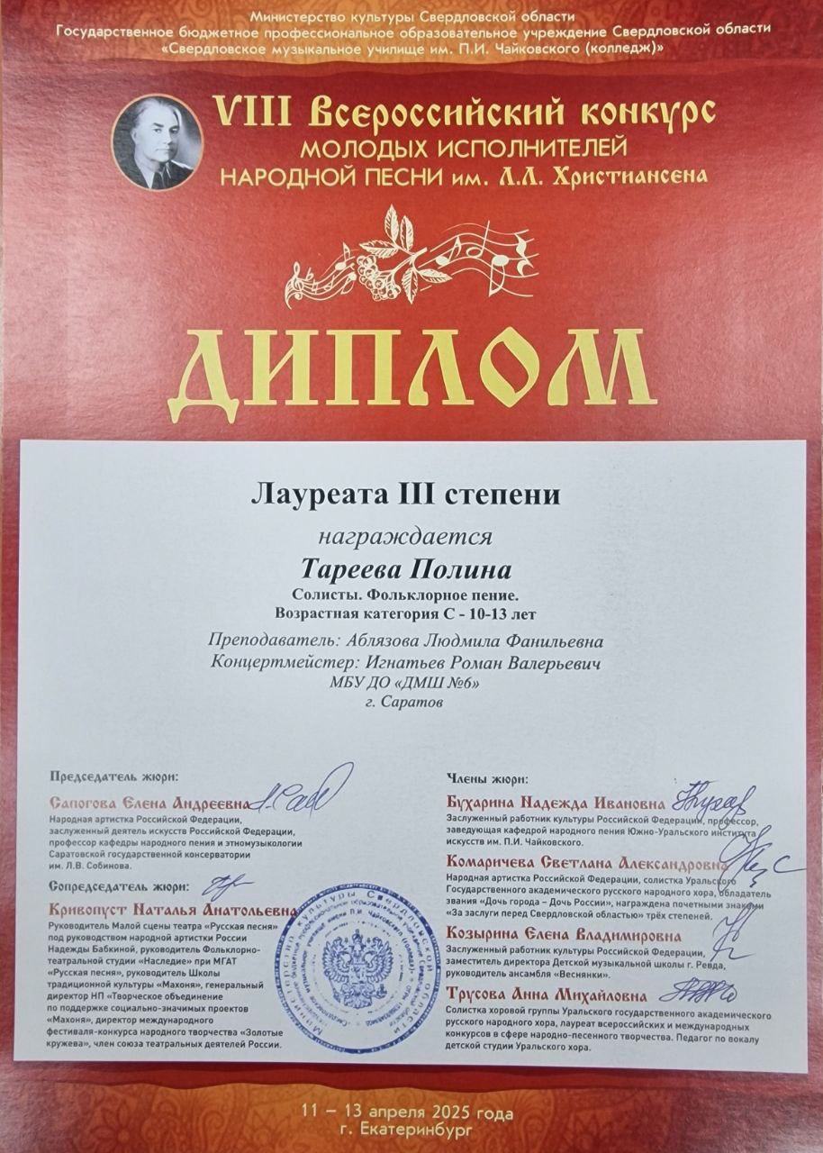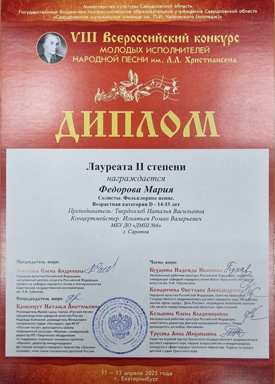 С 11 по 13 апреля 2025 года в Екатеринбурге прошёл VIII Всероссийский конкурс молодых исполнителей народной песни им. Л.Л. Христиансена. Конкурсные прослушивания состоялись на площадке Свердловского музыкального училища им. П. И. Чайковского (колледж) в очной и заочной (по видеозаписям) формах.