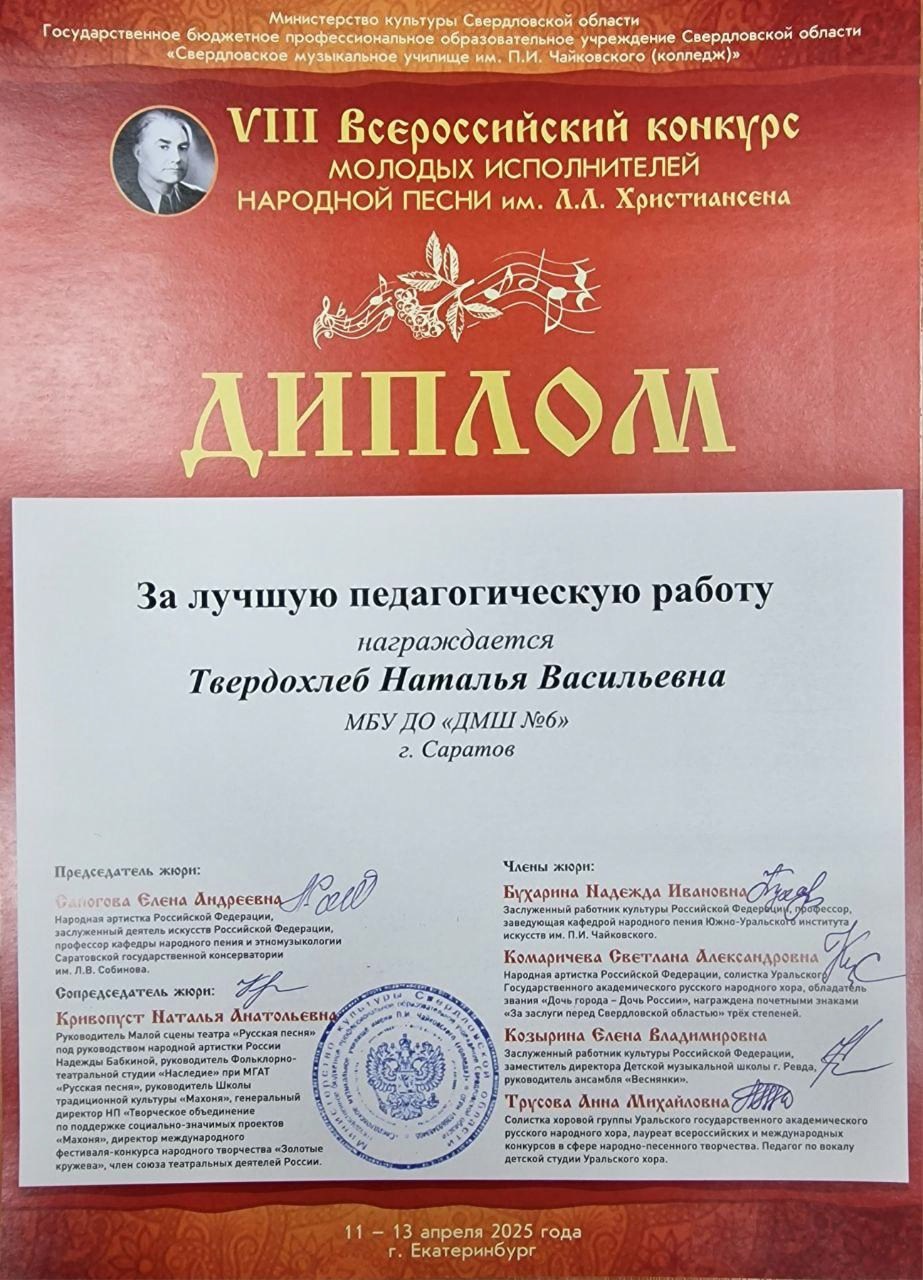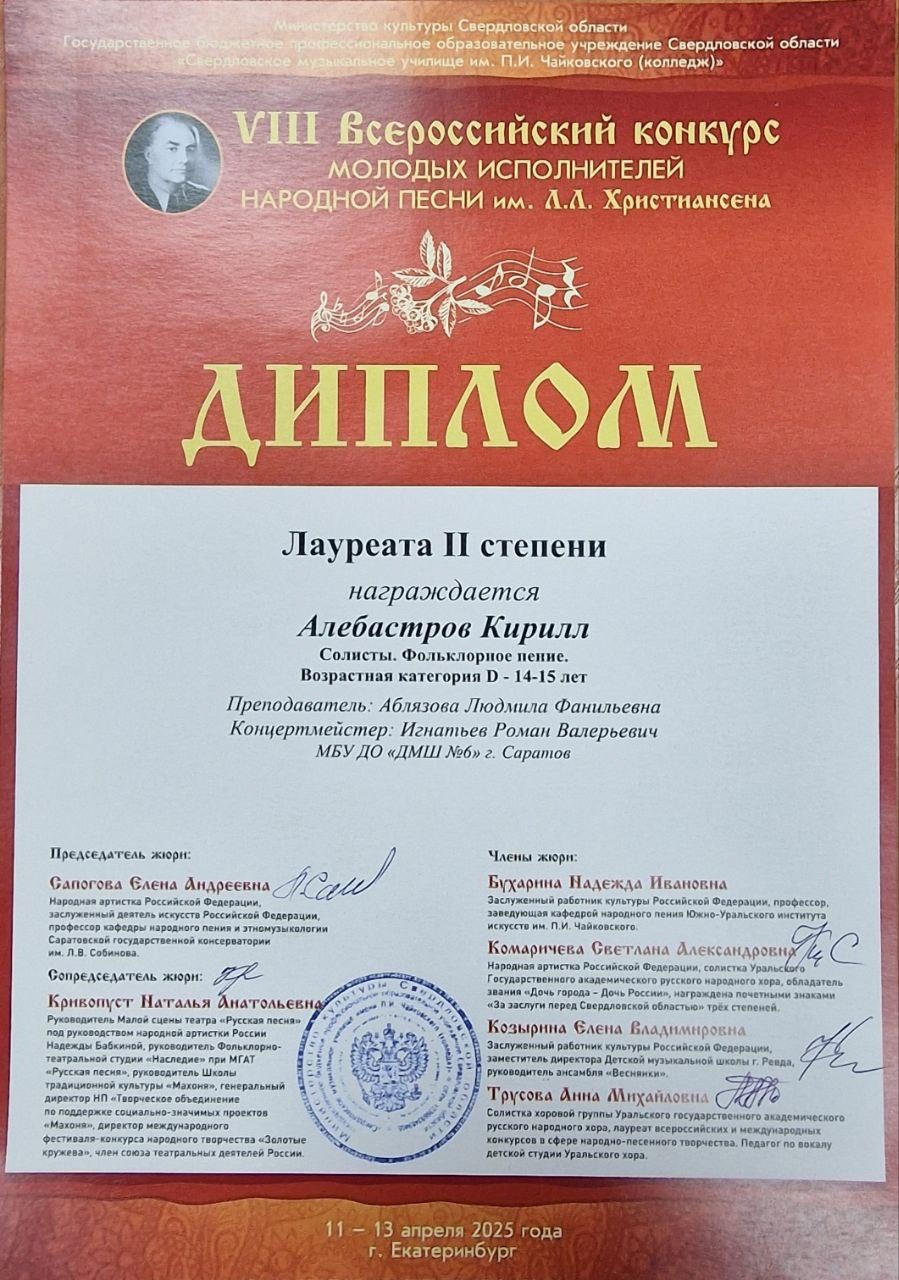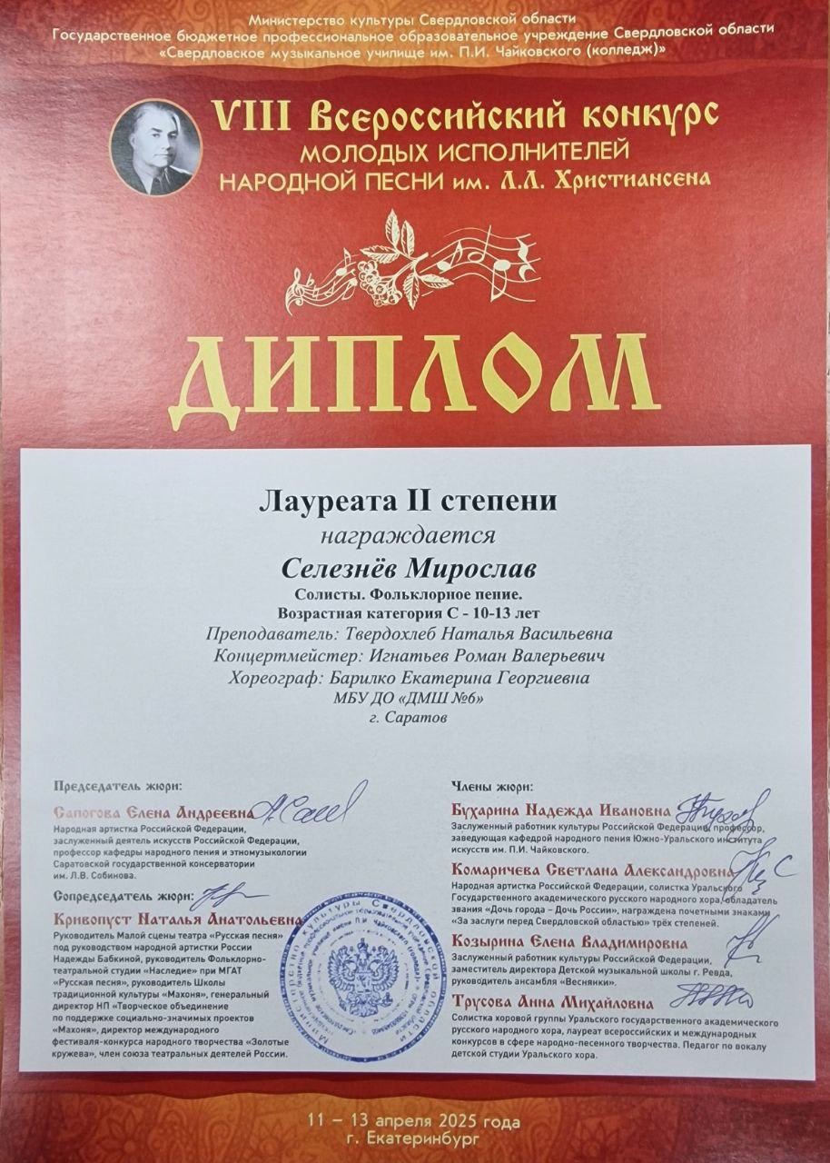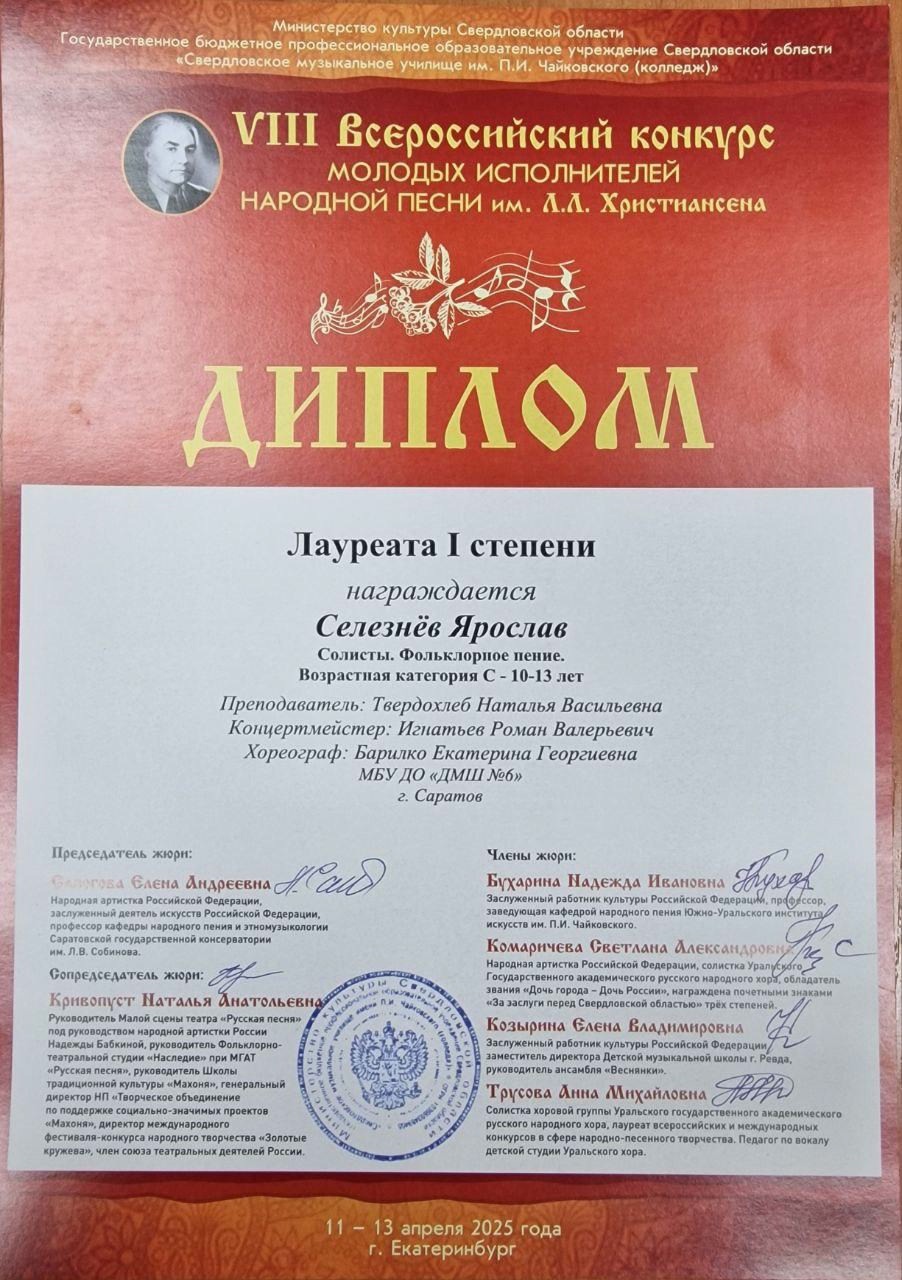 С 11 по 13 апреля 2025 года в Екатеринбурге прошёл VIII Всероссийский конкурс молодых исполнителей народной песни им. Л.Л. Христиансена. Конкурсные прослушивания состоялись на площадке Свердловского музыкального училища им. П. И. Чайковского (колледж) в очной и заочной (по видеозаписям) формах.