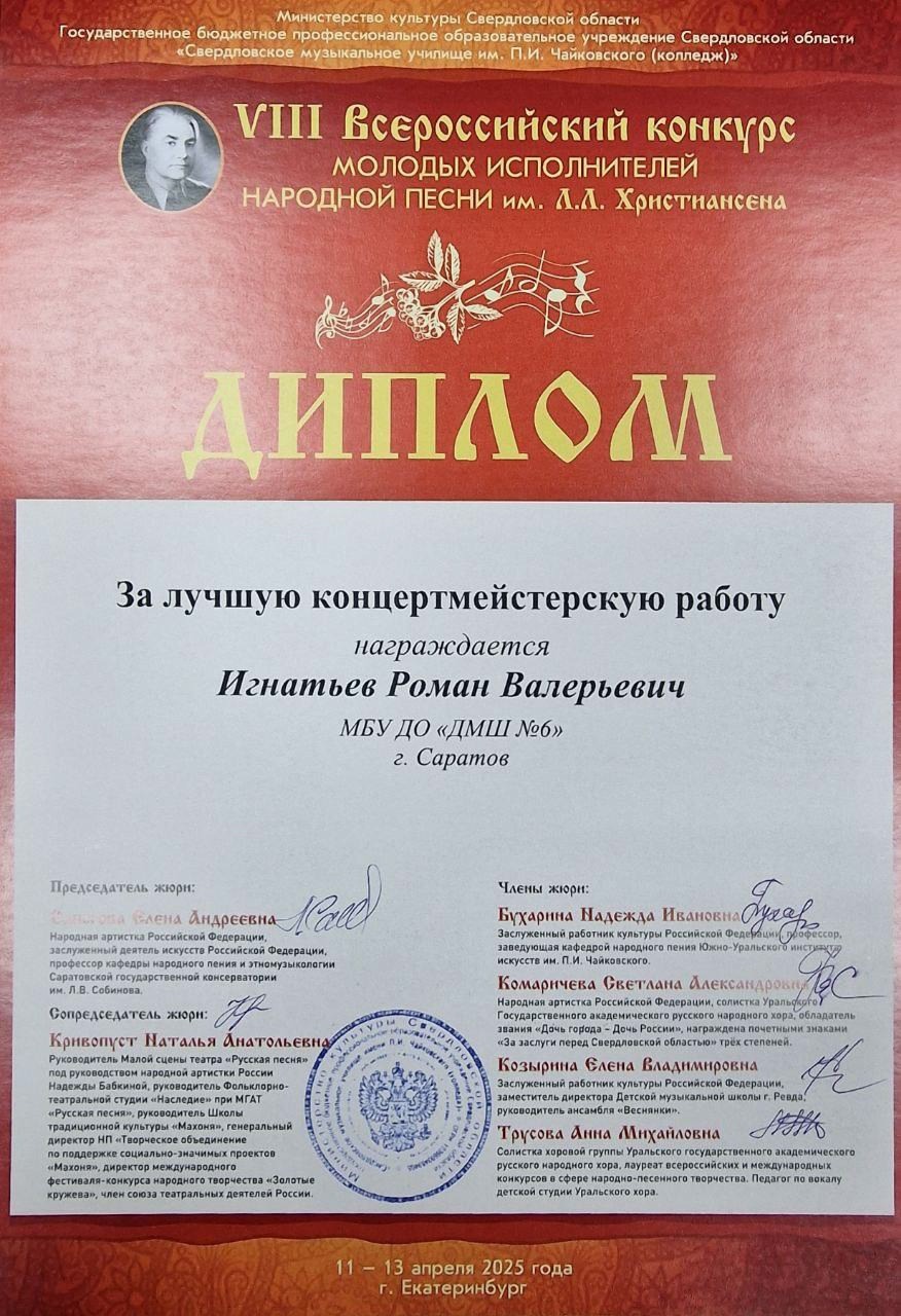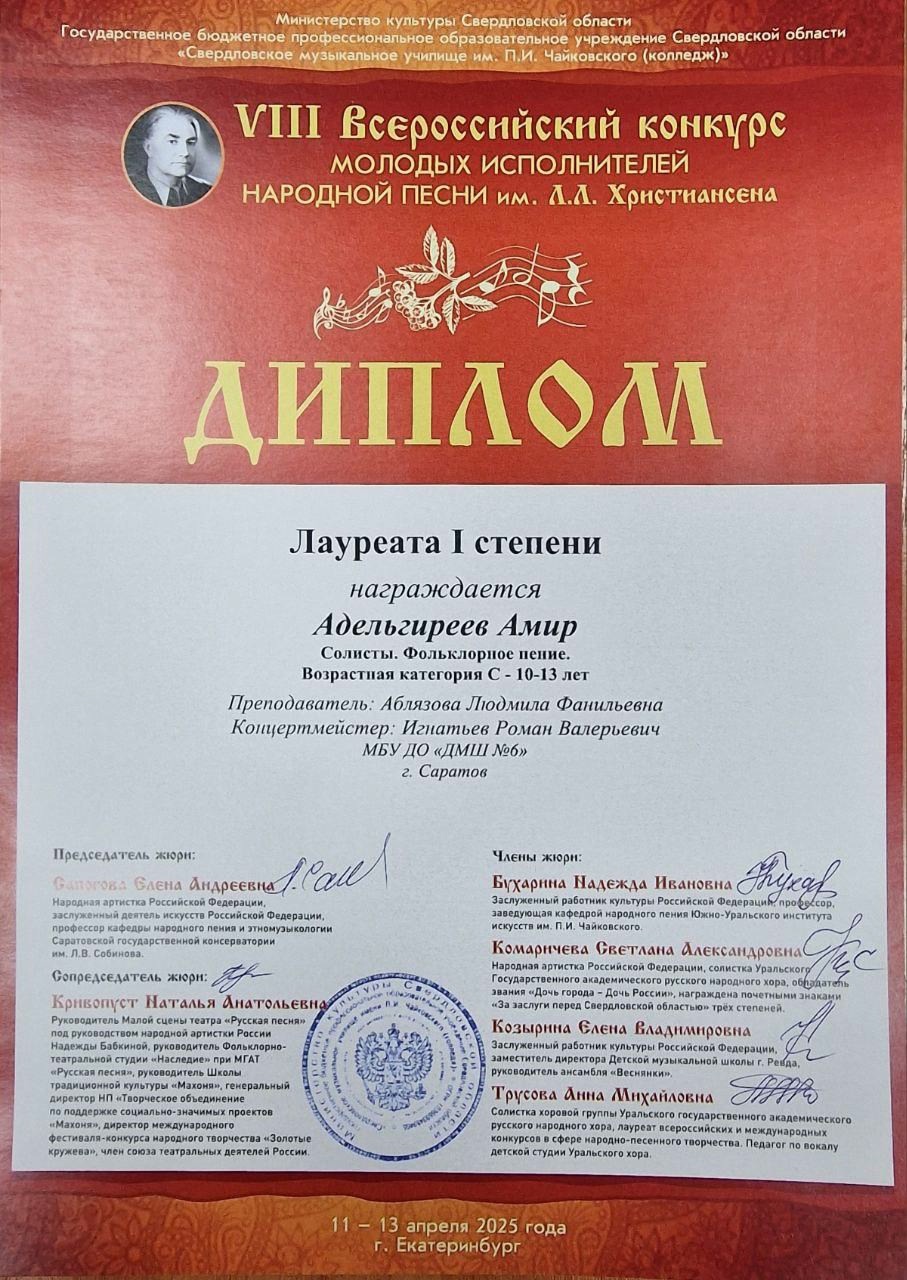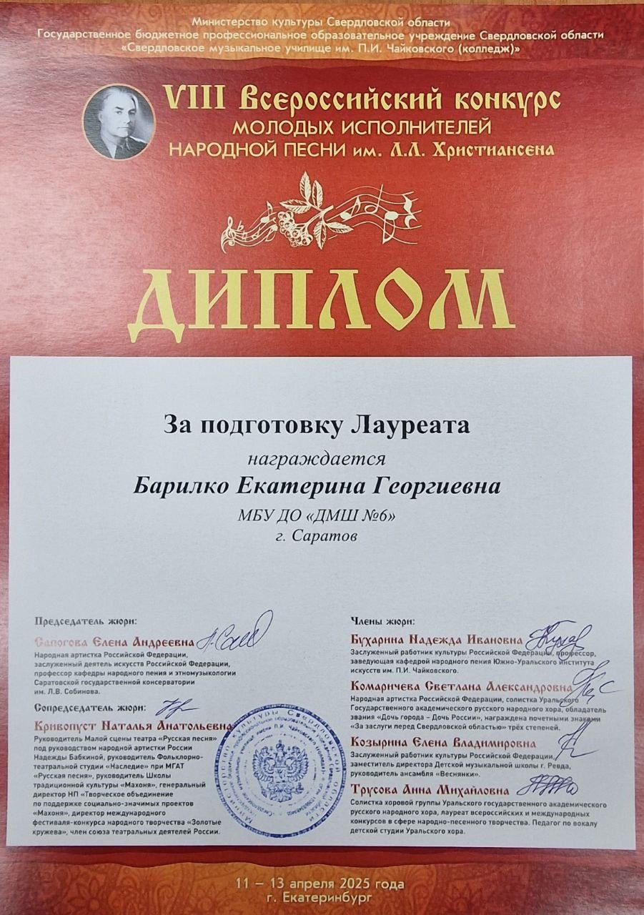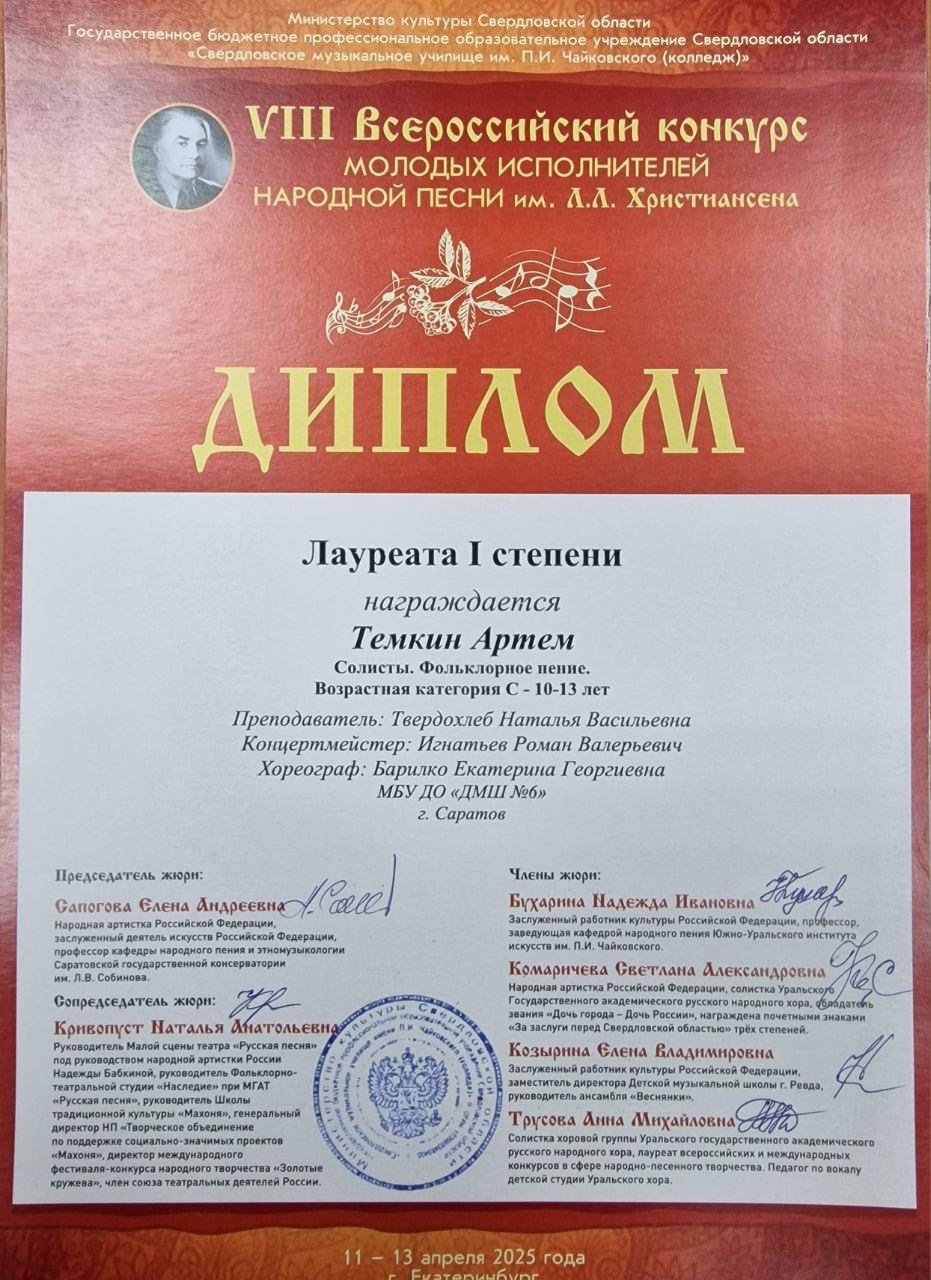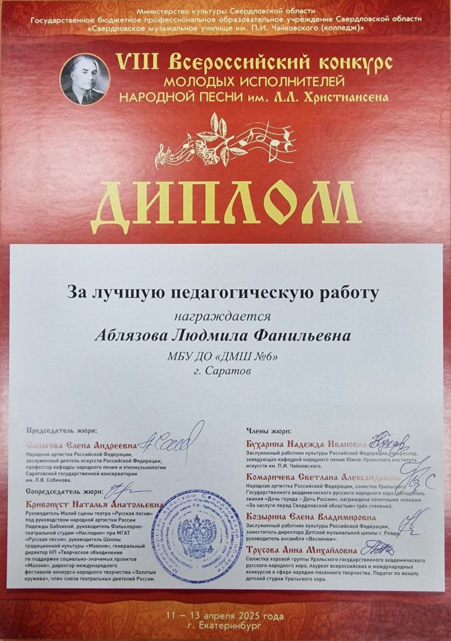 С 11 по 13 апреля 2025 года в Екатеринбурге прошёл VIII Всероссийский конкурс молодых исполнителей народной песни им. Л.Л. Христиансена. Конкурсные прослушивания состоялись на площадке Свердловского музыкального училища им. П. И. Чайковского (колледж) в очной и заочной (по видеозаписям) формах.