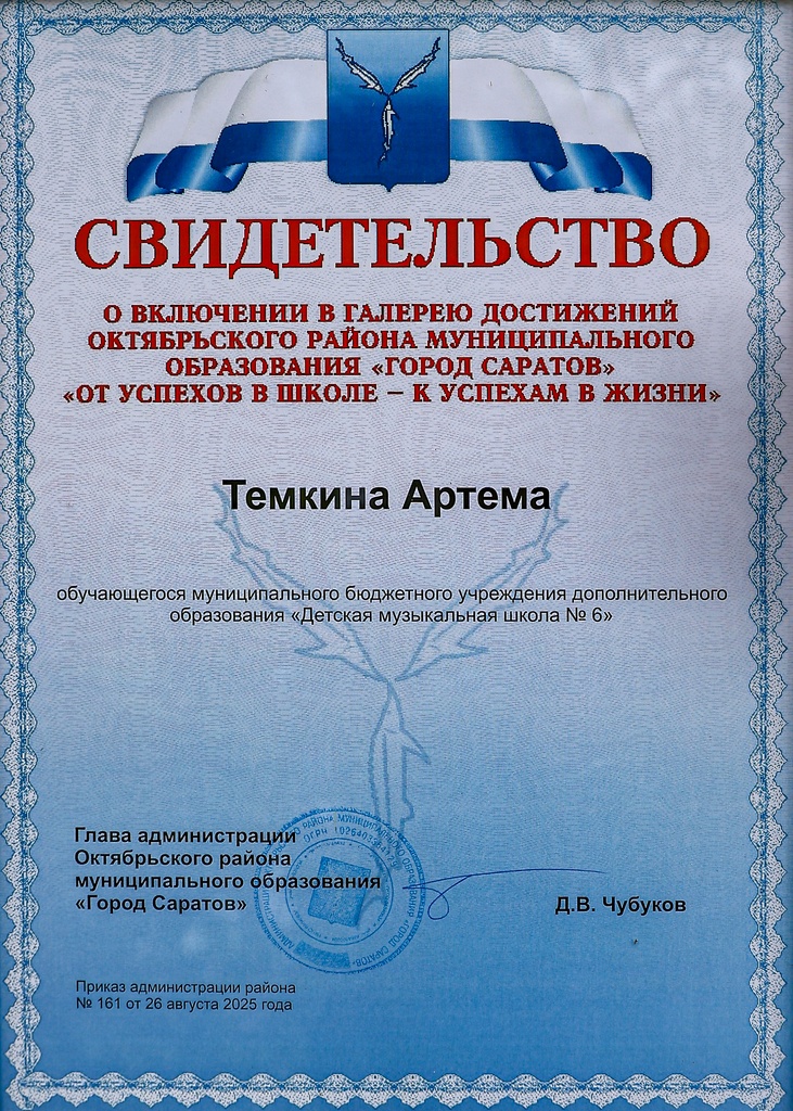 В рамках празднования 435-летия Саратова состоялась торжественная церемония вручения свидетельств лучшим учащимся Октябрьского района города Саратова о включении в галерею достижений «От успехов в школе – к успехам в жизни». В числе лучших стал учащийся Детской музыкальной школы № 6, Темкин Артём, класс преподавателя Твердохлеб Натальи Васильевны. Поздравляем с высокими результатами и желаем Артёму и его педагогу дальнейших творческих успехов и побед на конкурсах!
