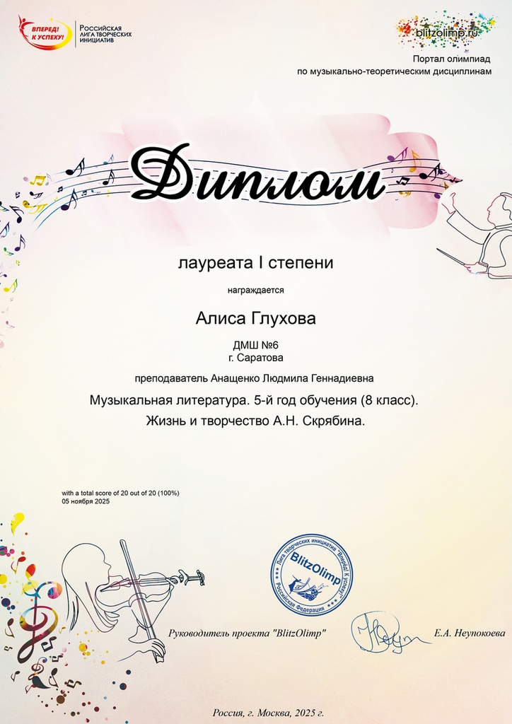 Глухову Алису – лауреата I степени олимпиады «Жизнь и творчество А.Н. Скрябина»