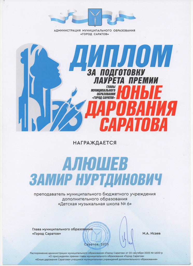 Лауреатом премии от Детской музыкальной школы № 6 стал Куркин Фёдор – учащийся класса преподавателя Алюшева Замира Нуртдиновича. От всей души поздравляем Фёдора с заслуженной наградой! Желаем дальнейших творческих успехов и новых побед!