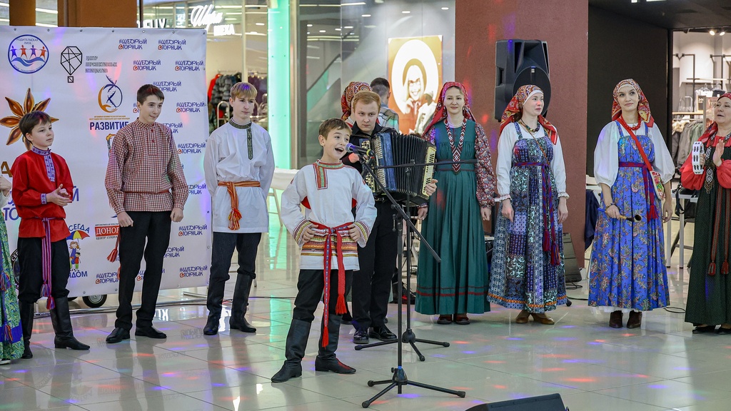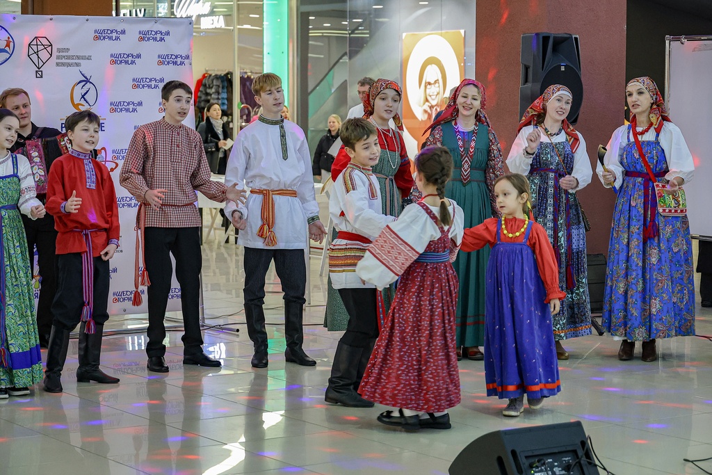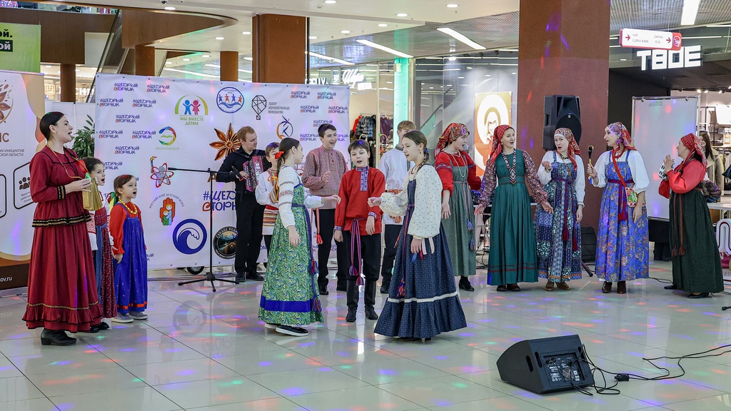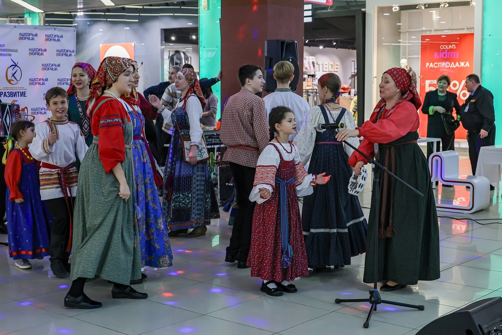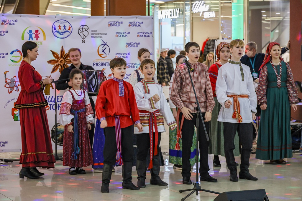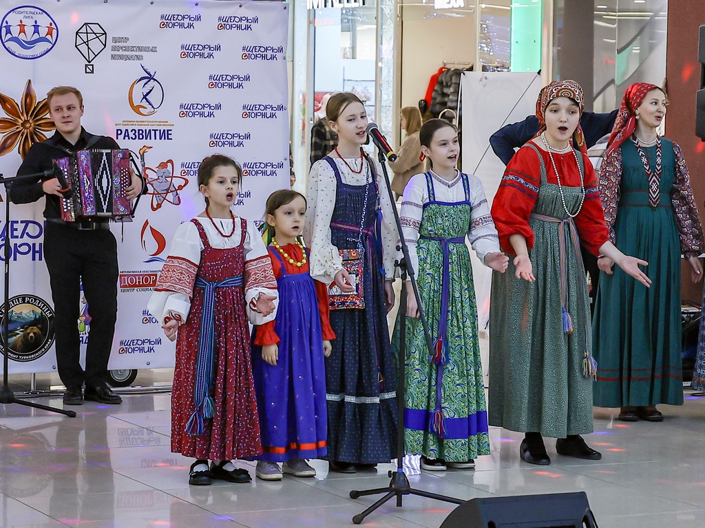 2 декабря 2025 года коллективы нашей школы – Семейный круг, Зернышко, Братцы, а так же солисты фольклорного отделения школы Селезневы Ярослав и Мирослав, Адельгиреев Амир приняли участие во Всероссийском благотворительном мероприятии #ЩедрыйВторник, которое проходило на концертной площадке в фойе 2 этажа в Тау Галерее для жителей города и области.
