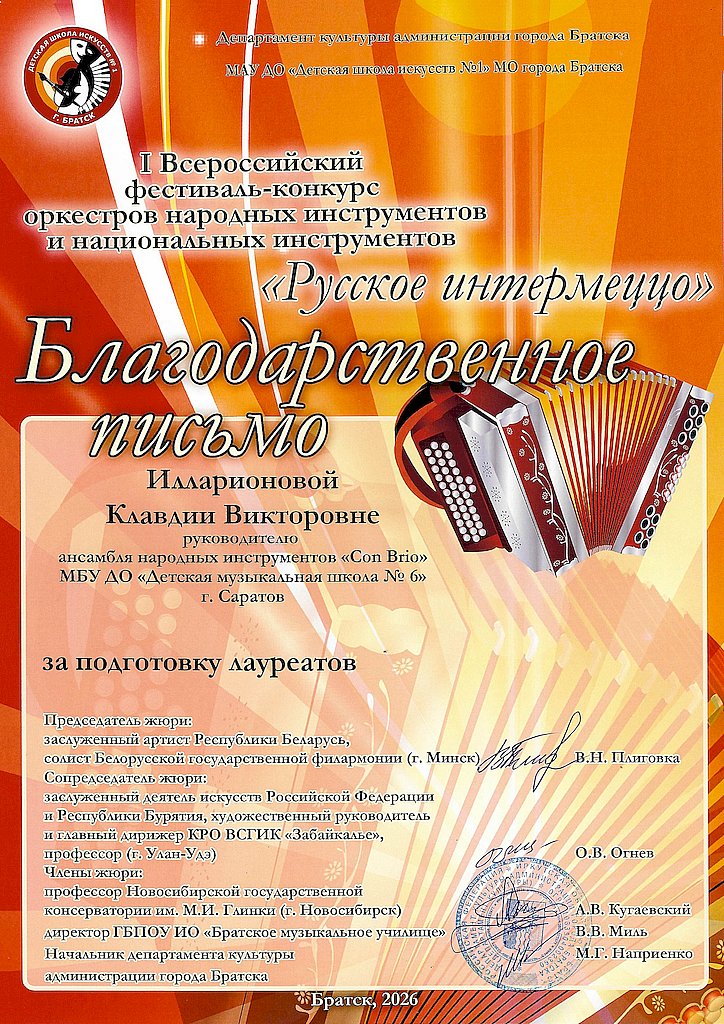 Поздравляем ансамбль народных инструментов «Con Brio» - лауреата II степени I Всероссийского фестиваля-конкурса оркестров народных инструментов и национальных инструментов «Русское интермеццо» в номинации «Ансамбль». Желаем ребятам и их преподавателю Илларионовой Клавдии Викторовне творческого вдохновения на пути к новым вершинам!