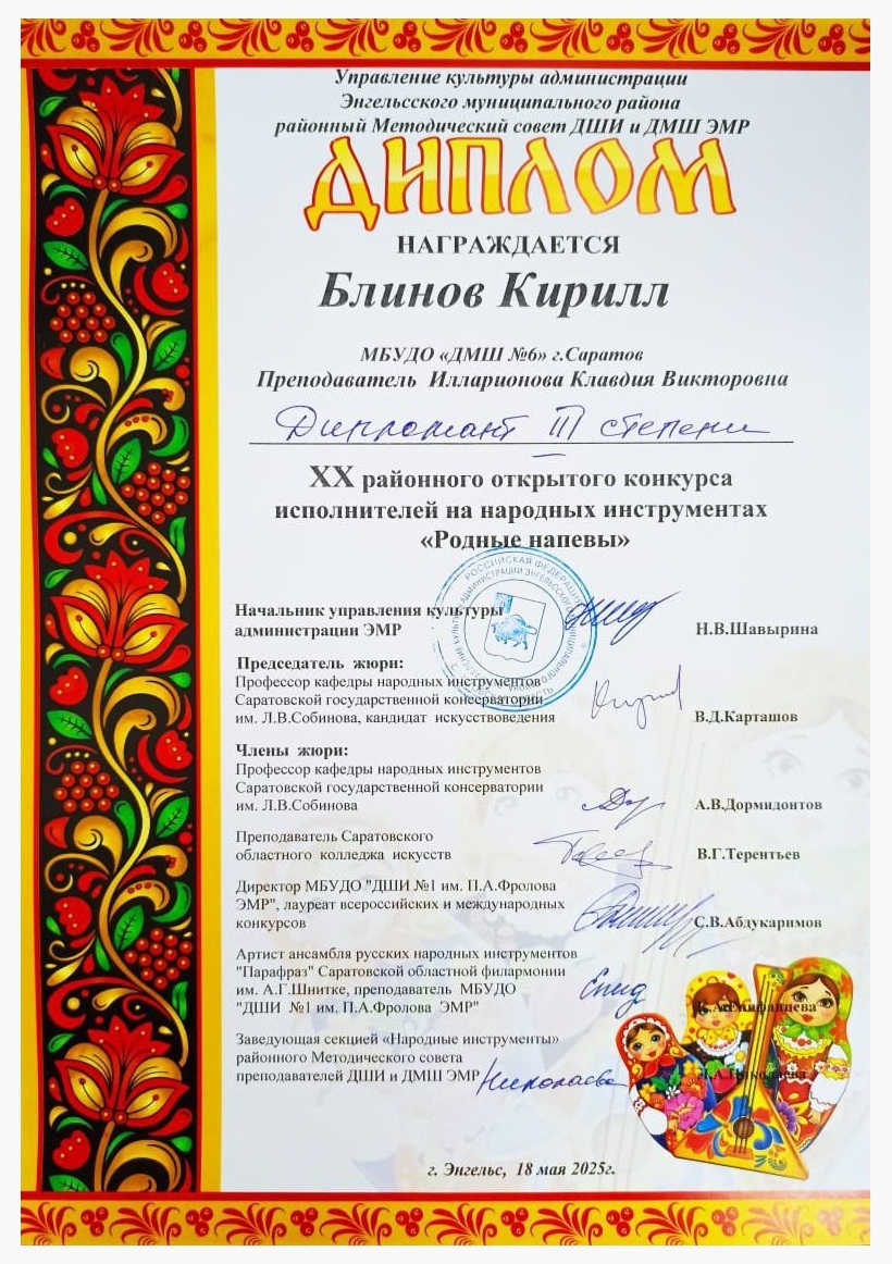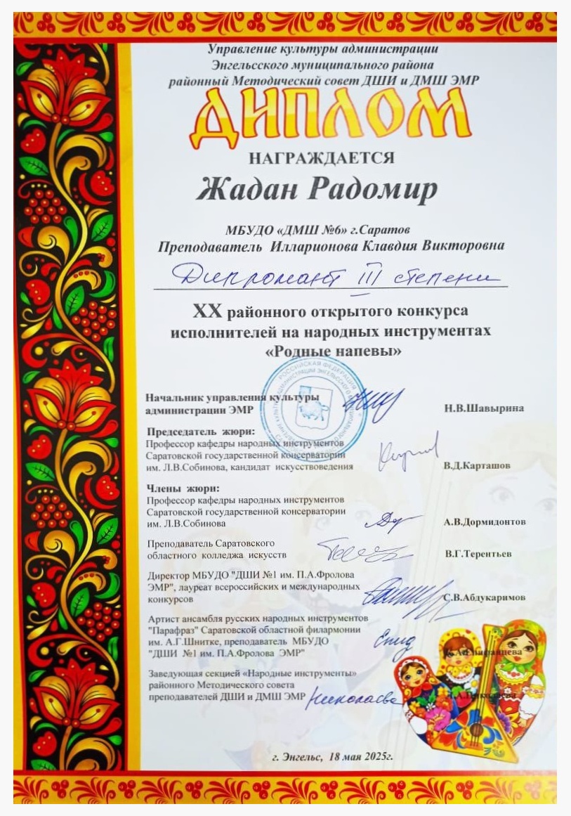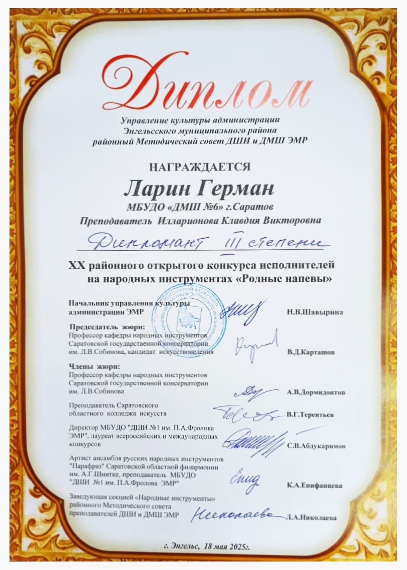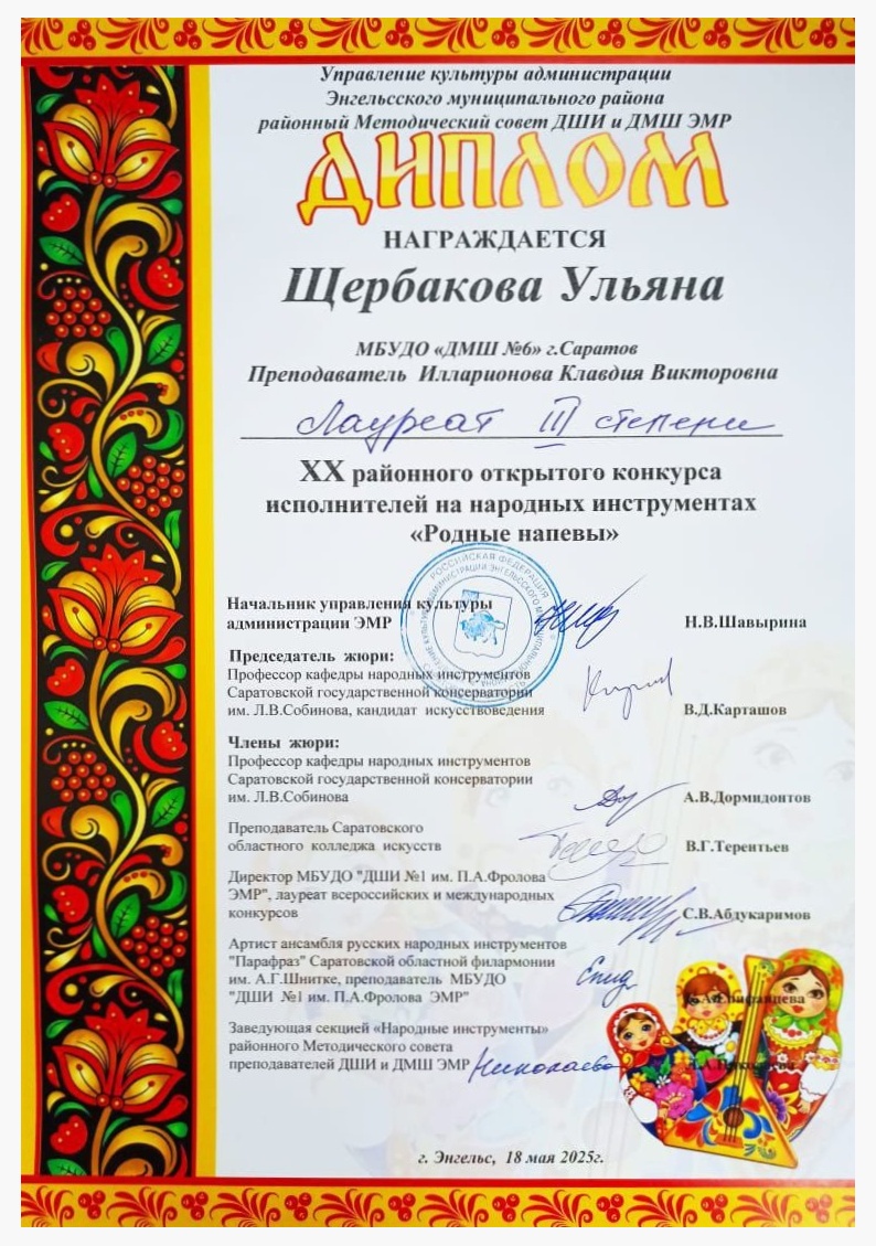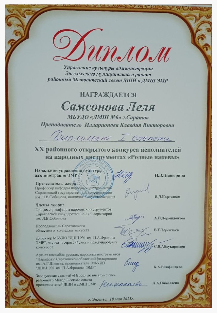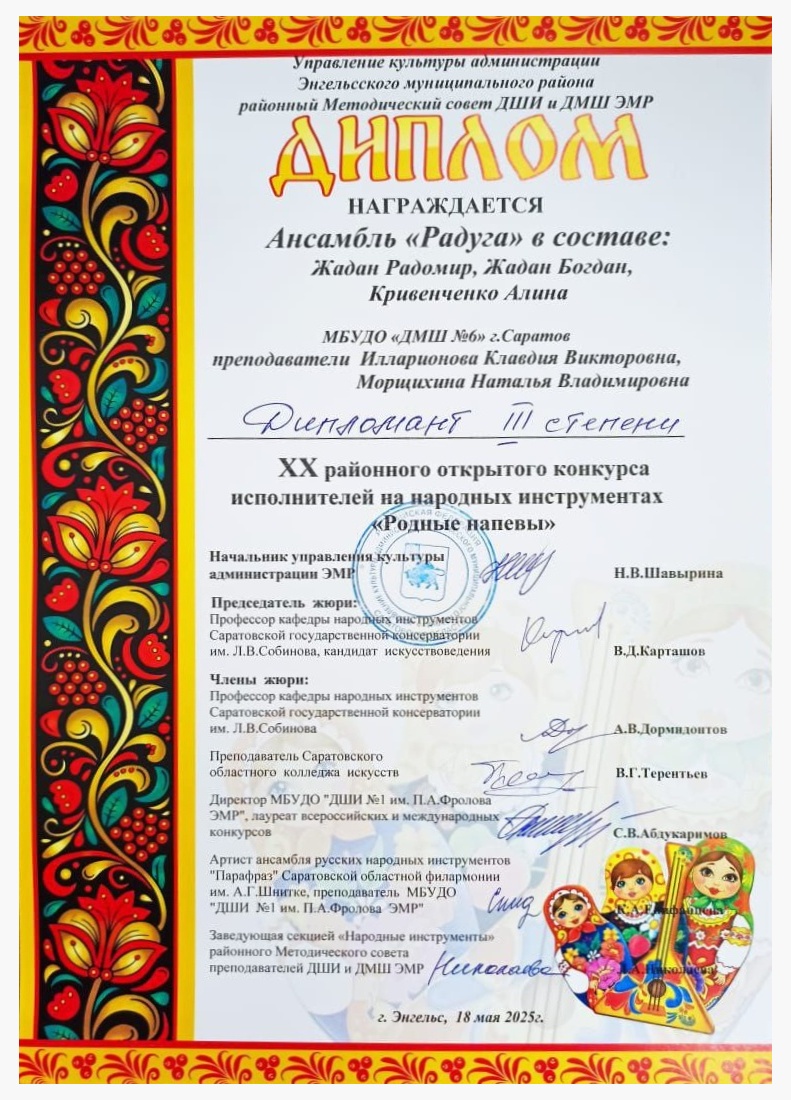 В Энгельсе прошел XX районный открытый конкурс исполнителей на народных инструментах "Родные напевы". Жюри конкурса состояло из профессоров, кандидатов искусствоведения, педагогов кафедры народных инструментов, Саратовской государственной консерватории им. Л.В. Собинова, а так же Саратовского областного колледжа искусств. В конкурсе приняли участие ученики педагога Илларионовой Клавдии Викторовны: Щербакова Ульяна, Ларин Герман, Блинов Кирилл, Жадан Радомир, Самсонова Леля. А так же ансамбль "Радуга", руководитель Морщихина Наталья Владимировна и Илларионова Клавдия Викторовна, в составе Кривенченко Алина, Жадан Радомир и Жадан Богдан. Все ученики были удостоены дипломами, получили ещё один опыт концертного выступления на большой сцене. Всех участников поощрили сладкими подарками. Желаем ребятам дальнейших творческих успехов и побед.