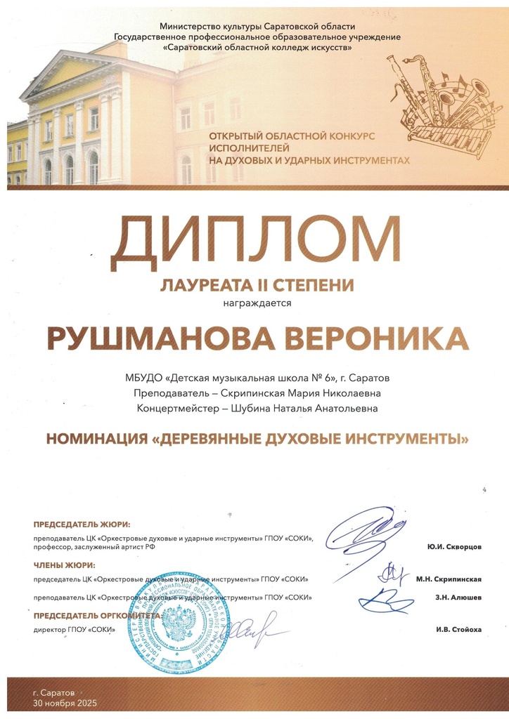 Поздравляем Рушманову Веронику – лауреата II степени открытого областного конкурса исполнителей на духовых и ударных инструментах в номинации «Деревянные духовые инструменты». Преподаватель Скрипинская Мария Николаевна, концертмейстер Шубина Наталья Анатольевна. Желаем Веронике творческих успехов и бесконечного вдохновения!