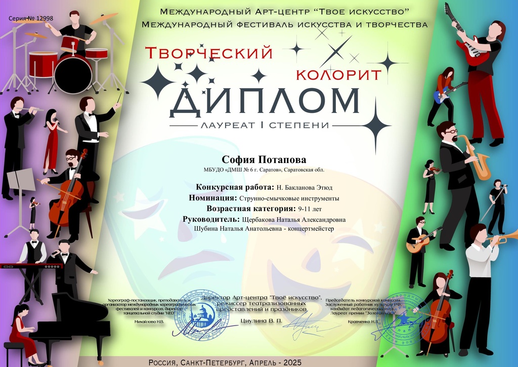 Поздравляем Потапову Софию – лауреата I степени Международного фестиваля искусства и творчества «Творческий колорит» в номинации «Струнно-смычковые инструменты».