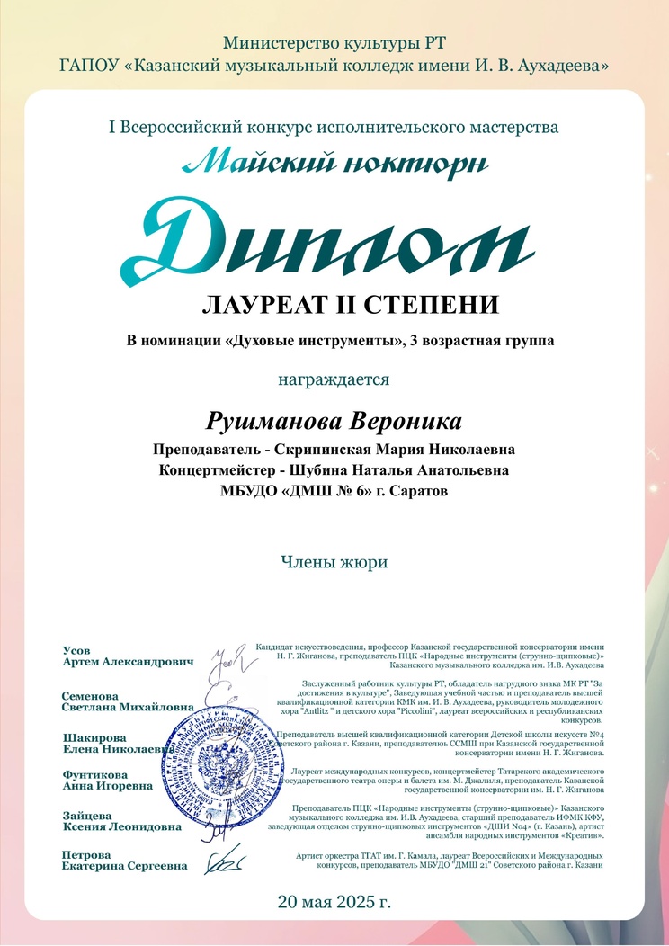 Поздравляем Рушманову Веронику – лауреата II степени I Всероссийского конкурса исполнительского мастерства «Майский ноктюрн» в номинации «Духовые инструменты» (3 возрастная группа). Желаем Веронике, её преподавателю Скрипинской Марии Николаевне и концертмейстеру Шубиной Наталье Анатольевне дальнейших творческих успехов и ярких побед!