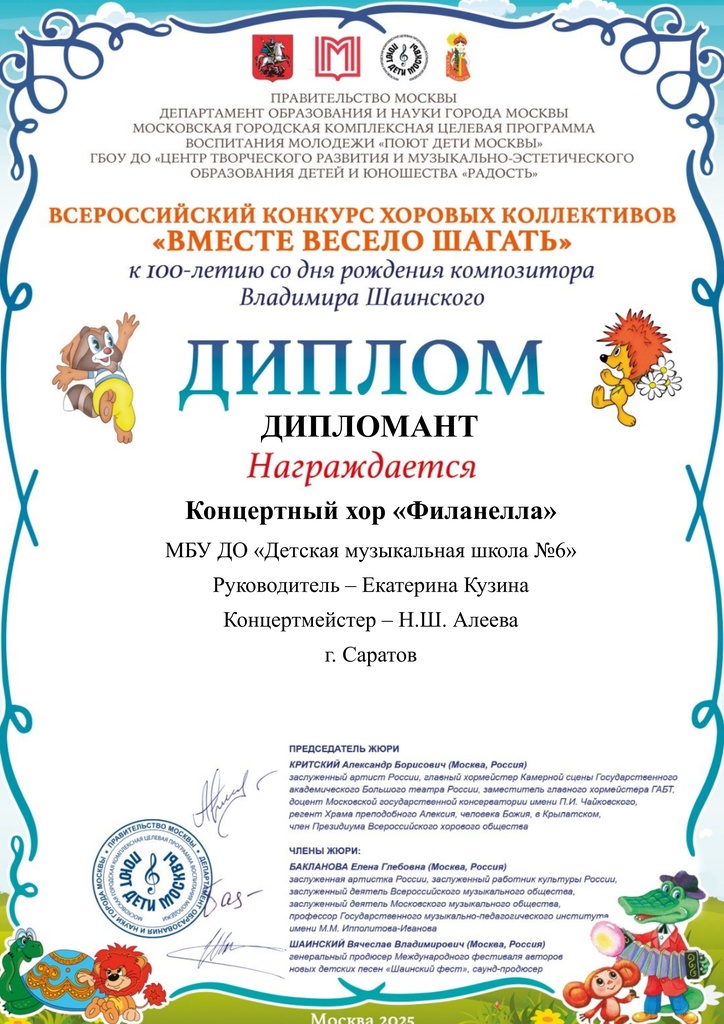 Поздравляем концертный хор «Филанелла», ставшего дипломантом Всероссийского конкурса хоровых коллективов «ВМЕСТЕ ВЕСЕЛО ШАГАТЬ» к 100-летию со дня рождения композитора Владимира Шаинского. Преподаватель Кузина Екатерина Александровна, концертмейстер Алеева Наиля Шамратовна. Желаем дальнейших творческих достижений!
