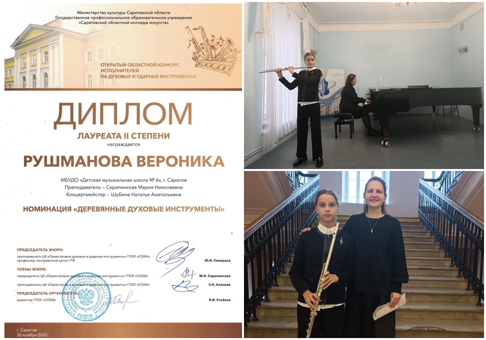 Поздравляем Рушманову Веронику – лауреата II степени открытого областного конкурса исполнителей на духовых и ударных инструментах в номинации «Деревянные духовые инструменты». Преподаватель Скрипинская Мария Николаевна, концертмейстер Шубина Наталья Анатольевна. Желаем Веронике творческих успехов и бесконечного вдохновения!