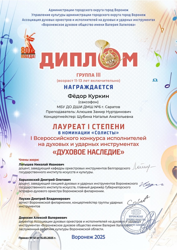 Куркин Фёдор – лауреат I степени Городского конкурса юных исполнителей на духовых инструментах «Щелкунчик» (саксофон), лучшее соло городского фестиваля по общему фортепиано «Я помню! Я горжусь!». Преподаватели Алюшев З.Н., Щербакова Т.В., концертмейстер Шубина Н.А.