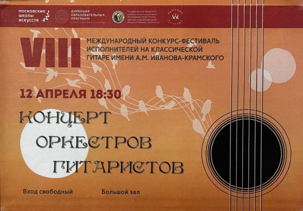 11-13 апреля в Москве прошел VIII Международный конкурс-фестиваль исполнителей на классической гитаре имени А.М. Иванова-Крамского. Организатором конкурса традиционно стала "Детская музыкальная школа им. А.М. Иванова-Крамского".