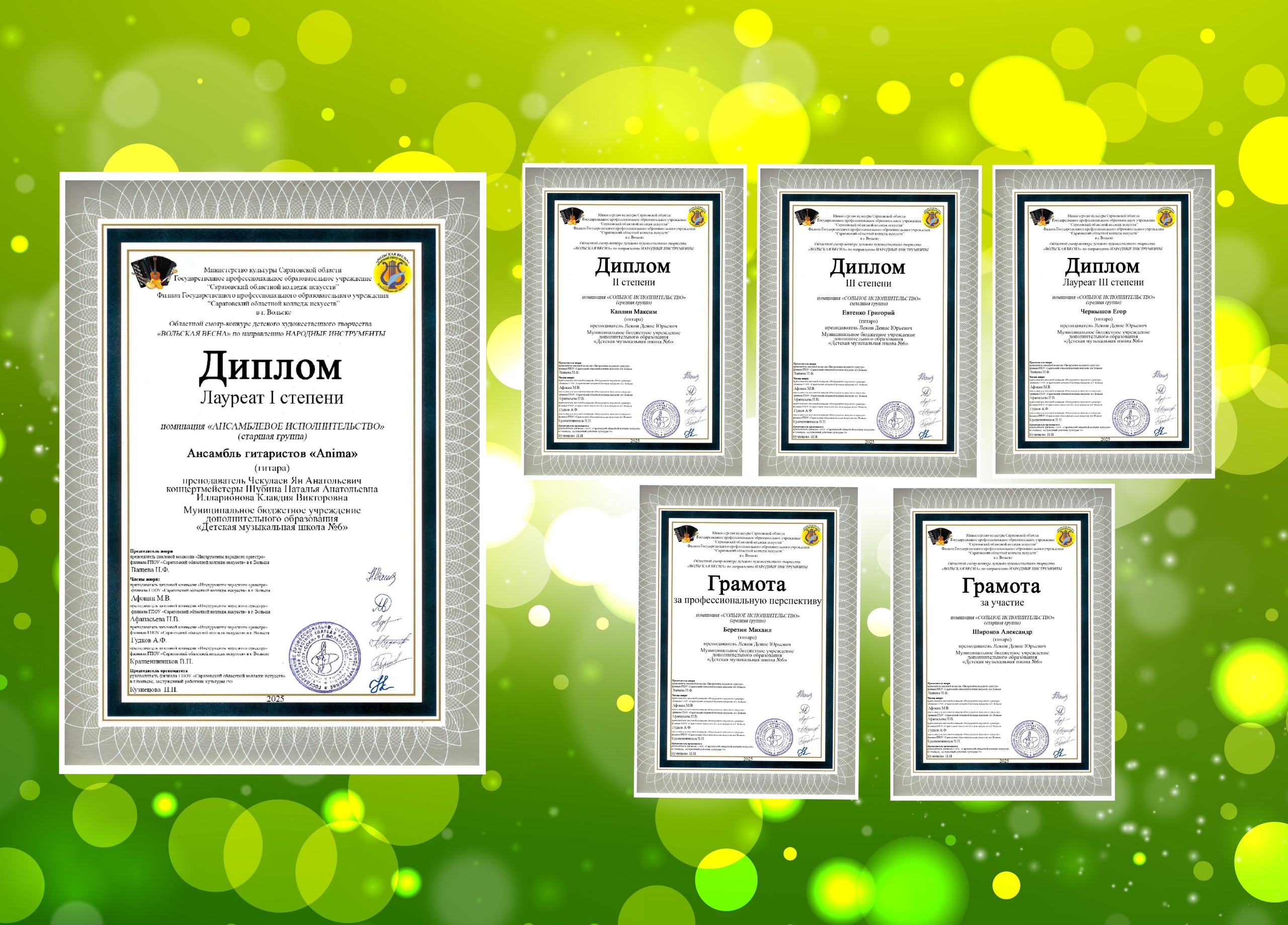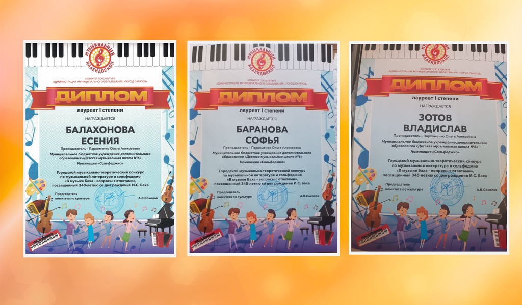 Званием Дипломанта конкурса и участником "Парада оркестров" пяти городов (Москва, Санкт-Петербург, Брянск, Саратов, Минск) стал Ансамбль "Anima" Детской музыкальной школы № 6 г. Саратова в составе Файзуллин Ринат, Петрова Елизавета, Молоткова Алёна, Березин Михаил, Носков Тимофей, Яваев Григорий, Сугак Михаил, Самарская Дарья, Чернышов Егор, Широков Александр, Каплин Максим, Ржевина Алёна.