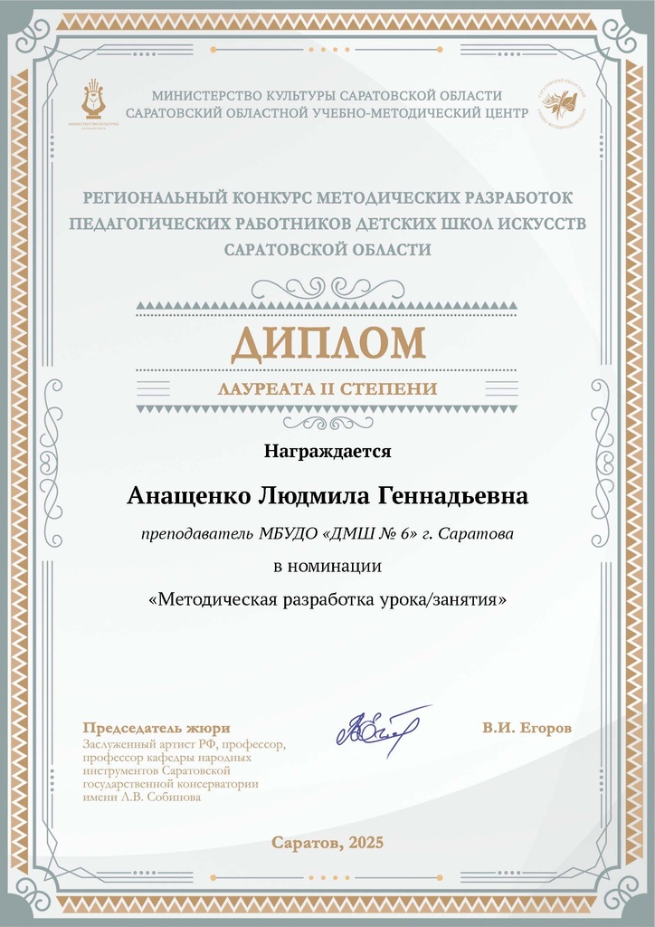 Поздравляем Анащенко Людмилу Геннадьевну – лауреата II степени Регионального конкурса методических разработок педагогических работников детских школ искусств Саратовской области в номинации «Методическая разработка урока/занятия». Гордимся нашим преподавателем!