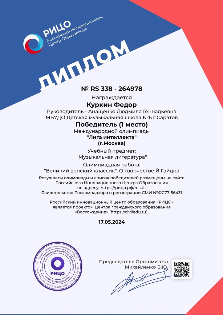 В направлении «Музыкально-теоретическая олимпиада «Пространство творчества А.Г. Шнитке» Куркин Фёдор – диплом участника. Преподаватели Анащенко Людмила Геннадьевна, Пархоменко Ольга Алексеевна.