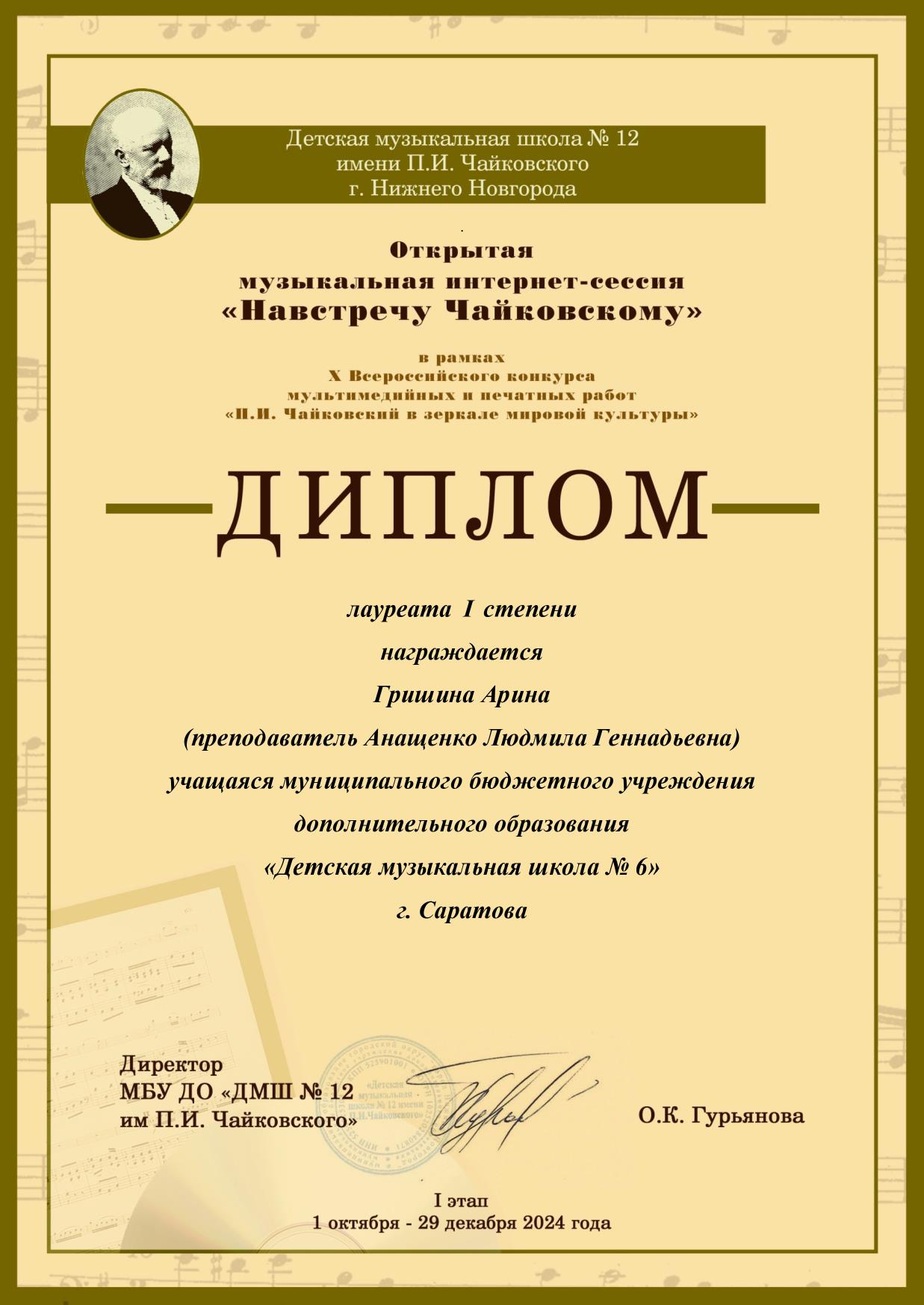 Поздравляем Гришину Арину – лауреата I степени X Всероссийского конкурса мультимедийных и печатных работ «П.И. Чайковский в зеркале мировой культуры». Желаем Арине и её преподавателю Анащенко Людмиле Геннадьевне дальнейших творческих достижений!