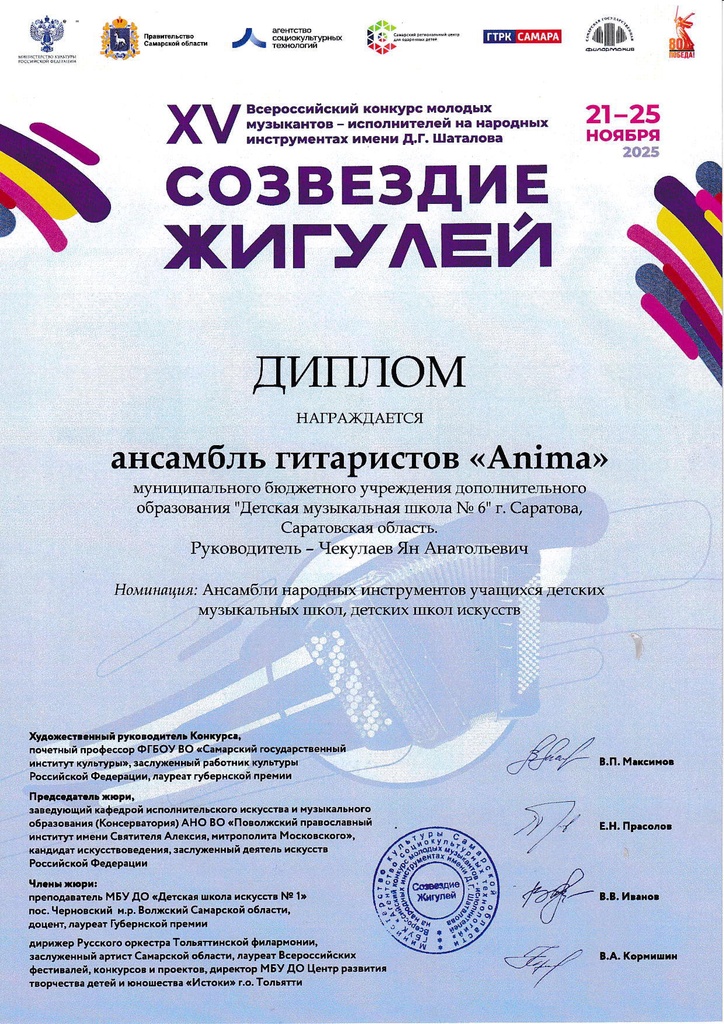 Поздравляем ансамбль «Anima», ставшего дипломантом XV Всероссийского конкурса молодых музыкантов – исполнителей на народных инструментах имени Д.Г. Шаталова «Созвездие Жигулей». Желаем дальнейших творческих достижений и побед!