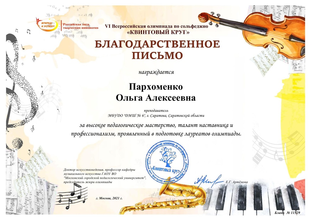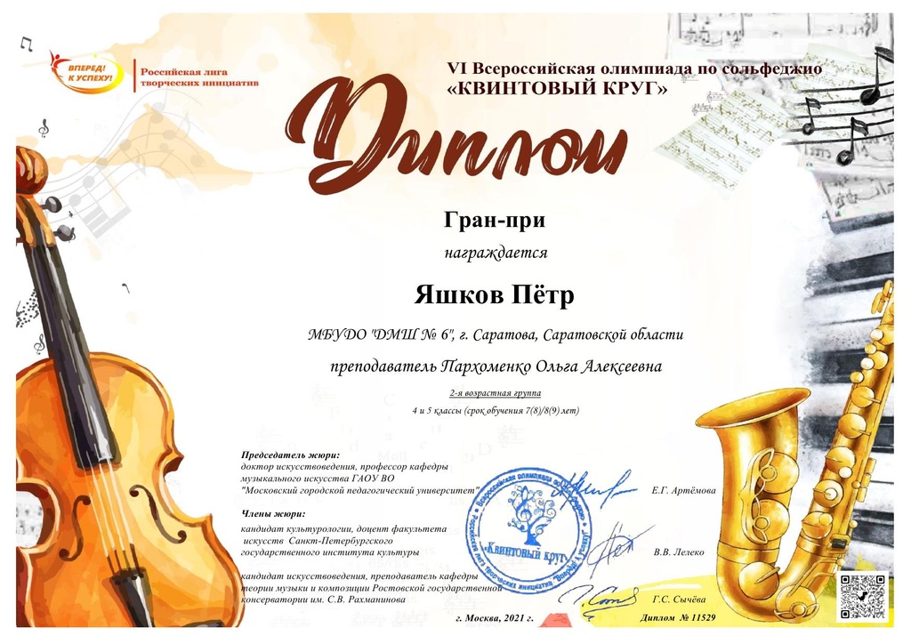 Поздравляем учащегося Детской музыкальной школы № 6 Яшкова Петра – обладателя высшей награды – ГРАН-ПРИ VI Всероссийской олимпиады по сольфеджио «Квинтовый круг». Желаем Петру и его преподавателю Пархоменко Ольге Алексеевне дальнейших творческих побед!