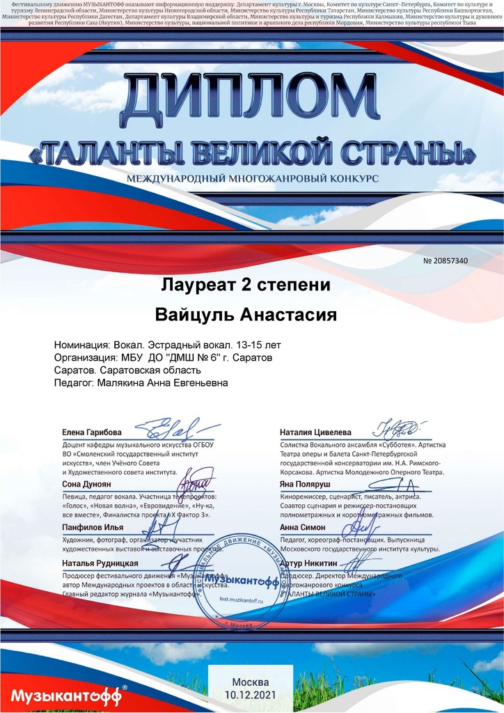 Поздравляем Вайцуль Анастасию – лауреата II степени Международного многожанрового конкурса «Таланты великой страны» в номинациях «Эстрадный вокал» и «Джазовый вокал»