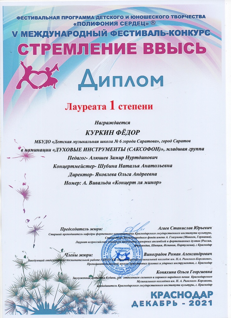 Поздравляем Куркина Фёдора – лауреата I степени V Международного фестиваля-конкурса «Стремление ввысь». Преподаватель Алюшев Замир Нуртдинович, концертмейстер Шубина Наталья Анатольевна. Желаем Фёдору дальнейших творческих побед!